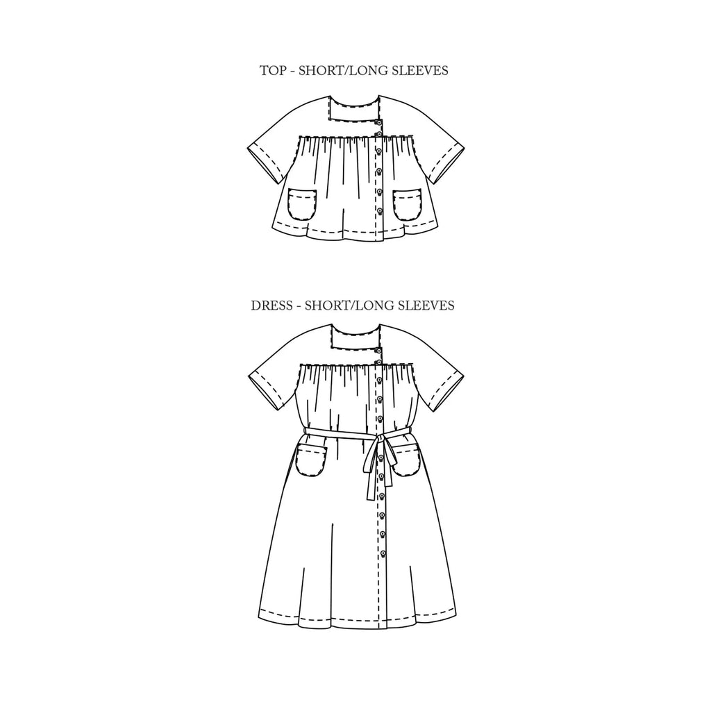 The Omilie is a smock style top or dress featuring patch pockets and in-seam pockets (dress only). Both options feature button fastenings in the front and can be sewn with either short or long sleeves.