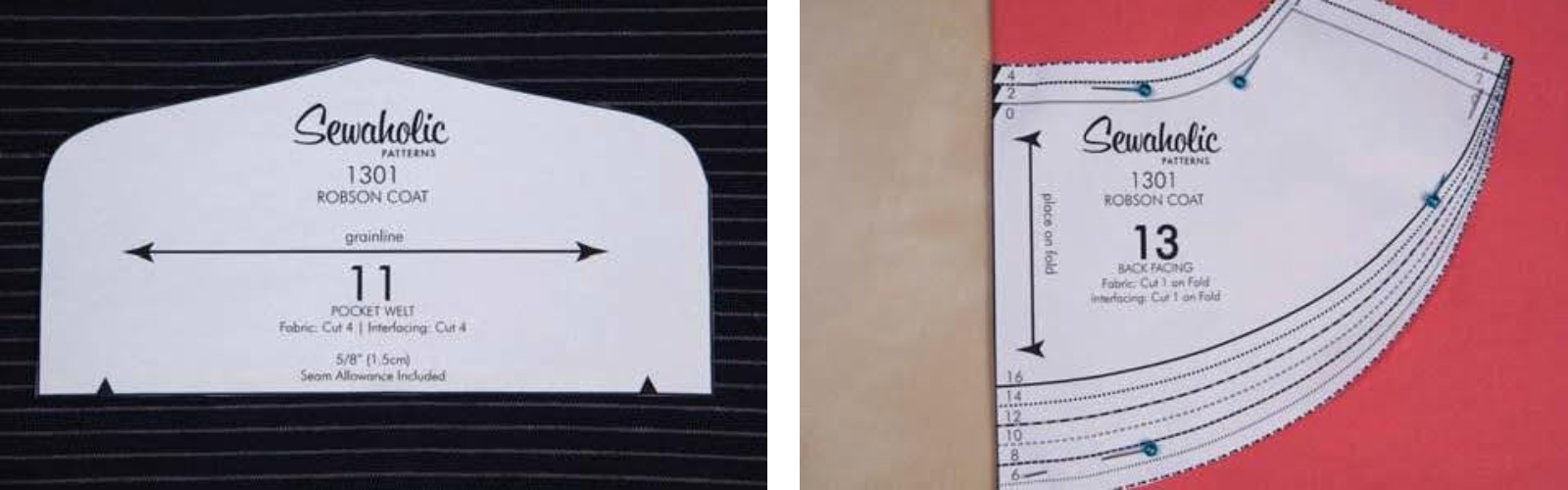 The pattern piece on the right shows a Place on Fold marking. This directs you to fold the fabric on the straight grain before cutting the pattern piece.