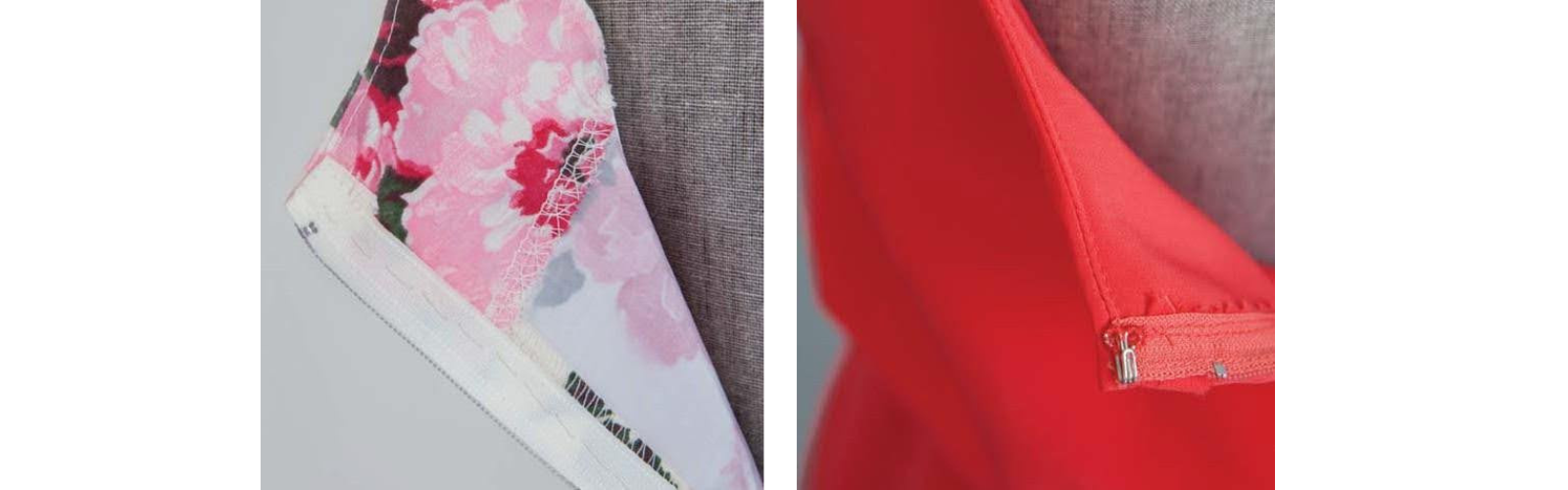 On the left, it's easy to spot the understitching in white thread against the floral print. It's the row of visible stitches near the top finished edge of the garment. You can also see just above the white stitches the seam that attaches the outside garment fabric to the facing. This seam is slightly towards the inside of the garment.