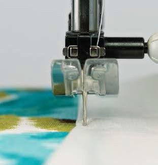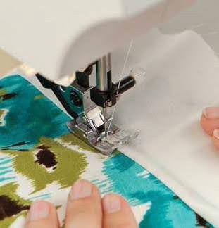 Lower your presser foot and begin stitching slowly as you stretch the seam open with your fingers. Begin with a small backstitch and continue following the fabric.