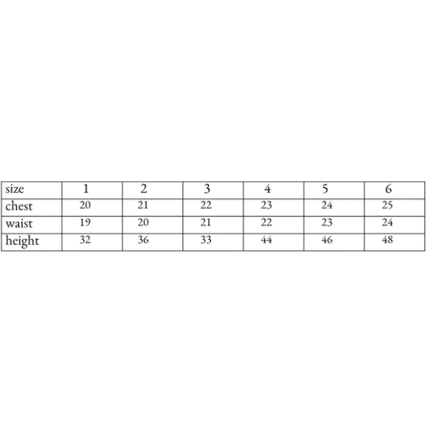 Sizes: 1-6 included; Chest: 20" - 25", Waist: 19" - 24", Height: 32” - 48”