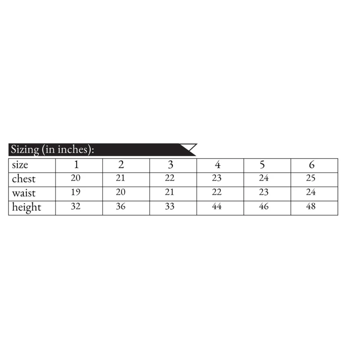 Sizes: 1 - 6, included; Chest: 20" - 25", Waist: 19” - 24”, Height: 32” - 48”
