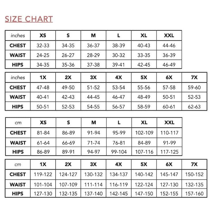 Sizes: XS - 7X included; Bust: 32" - 60", Waist: 24" - 53"
