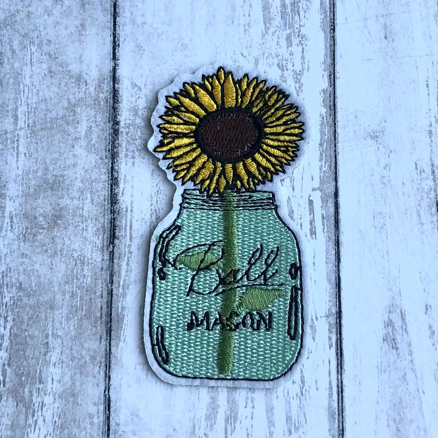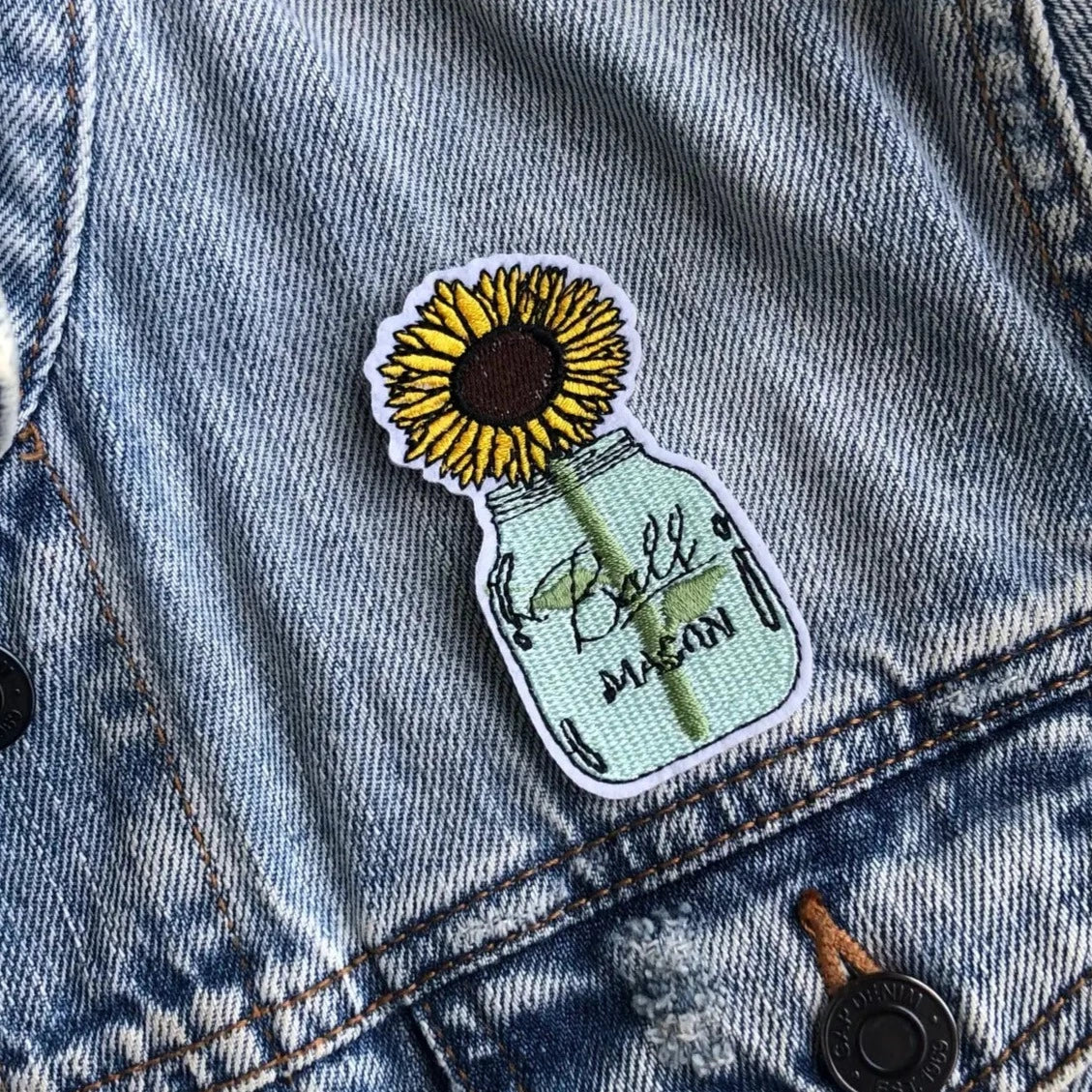 Mason jar with sunflower iron on embroidered patch.