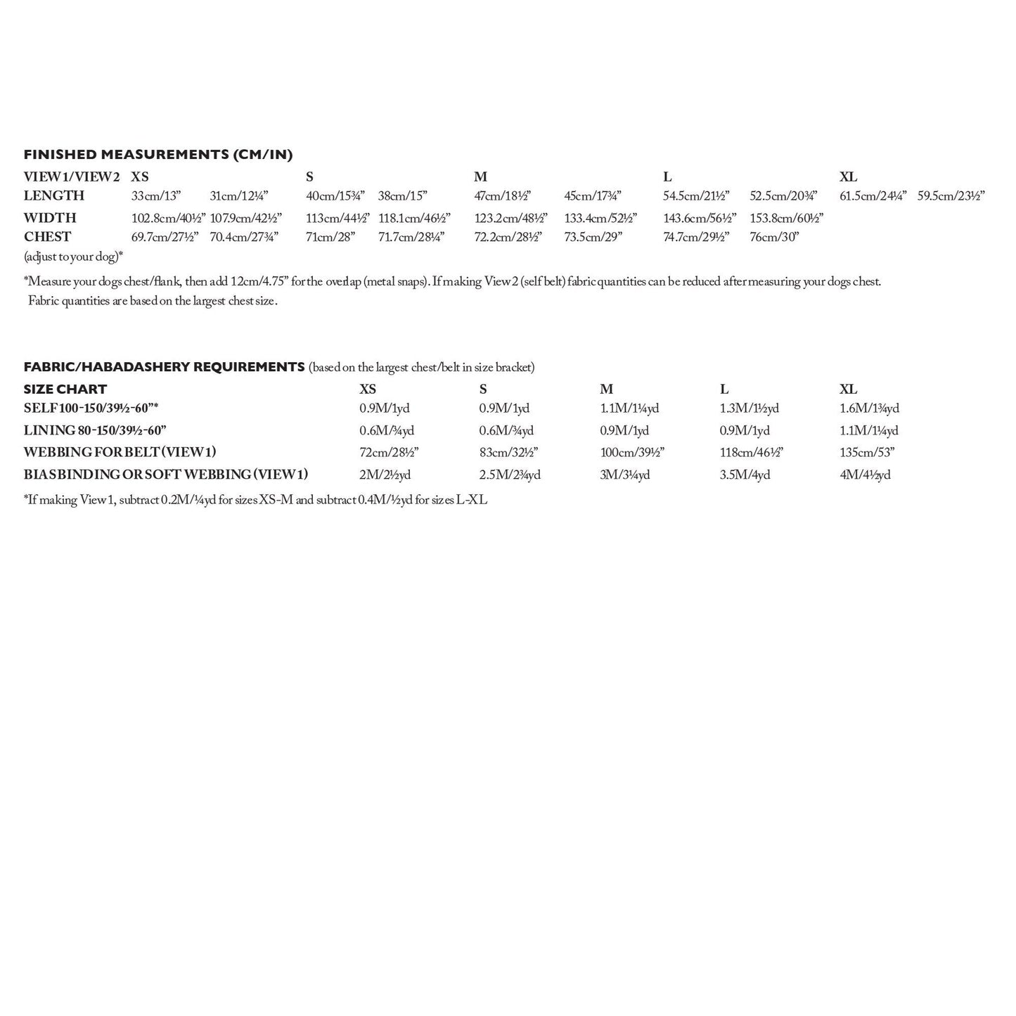 Sizes XS-S 45" - 60” wide = 1 yard