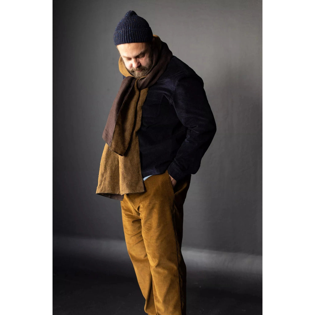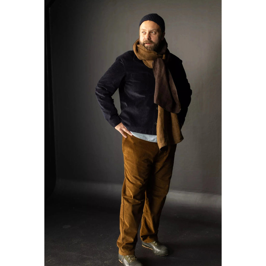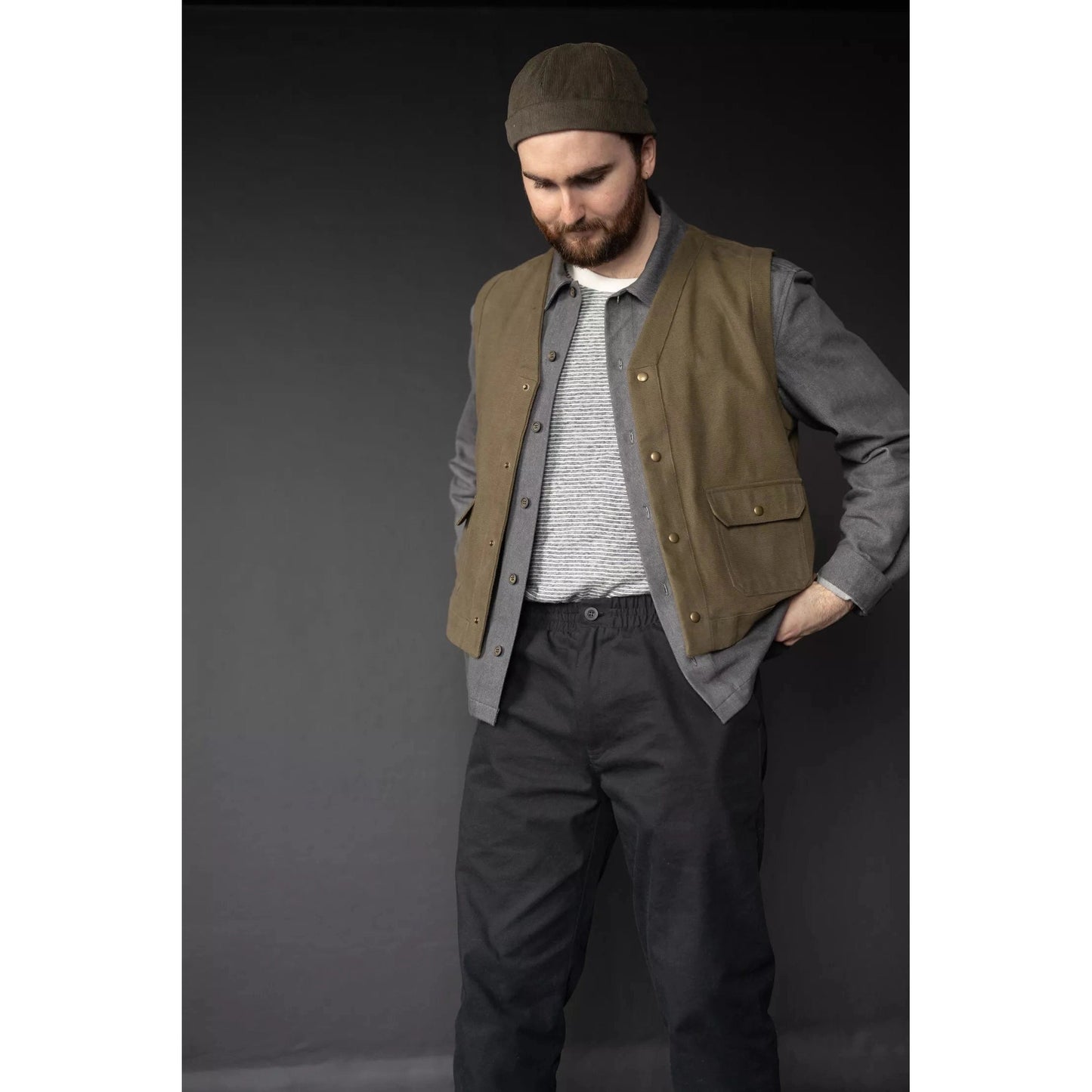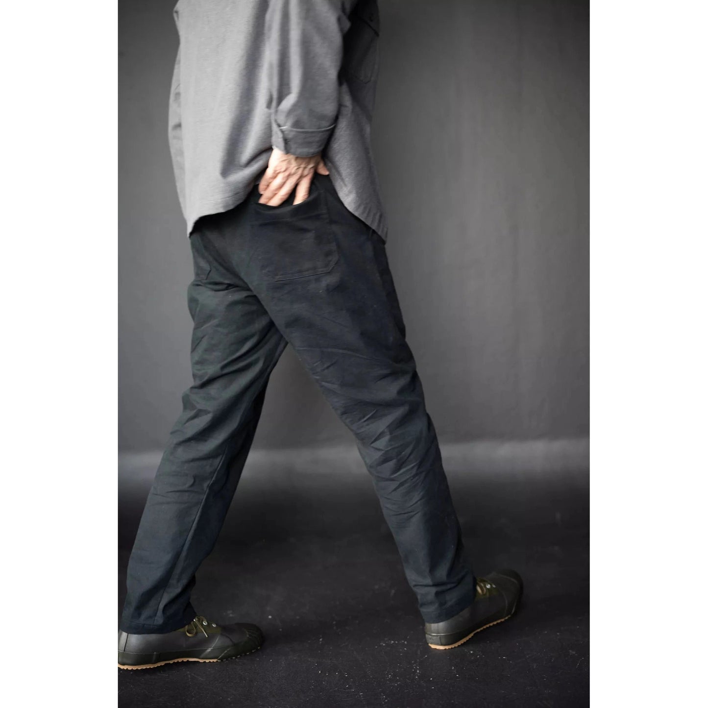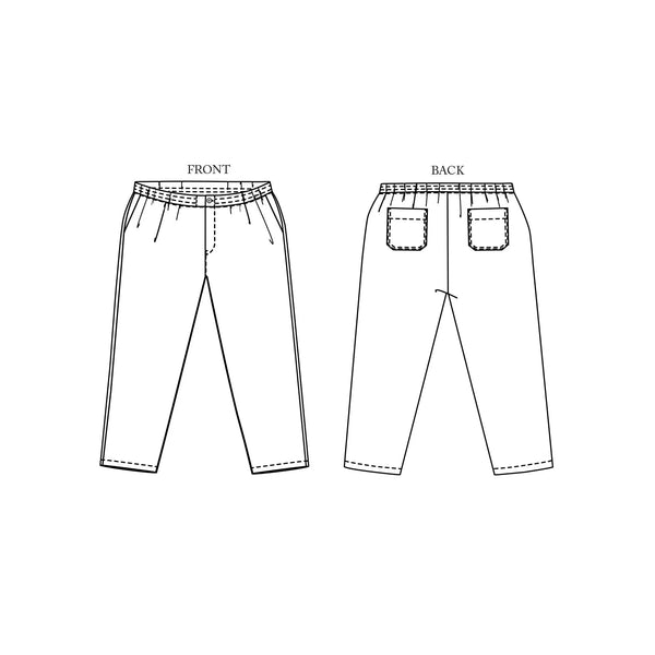 The Elling is a comfortable, everyday elasticated trouser pattern for men, that can be made with or without a zip. They have useful front slanted pockets and back patch pockets.
