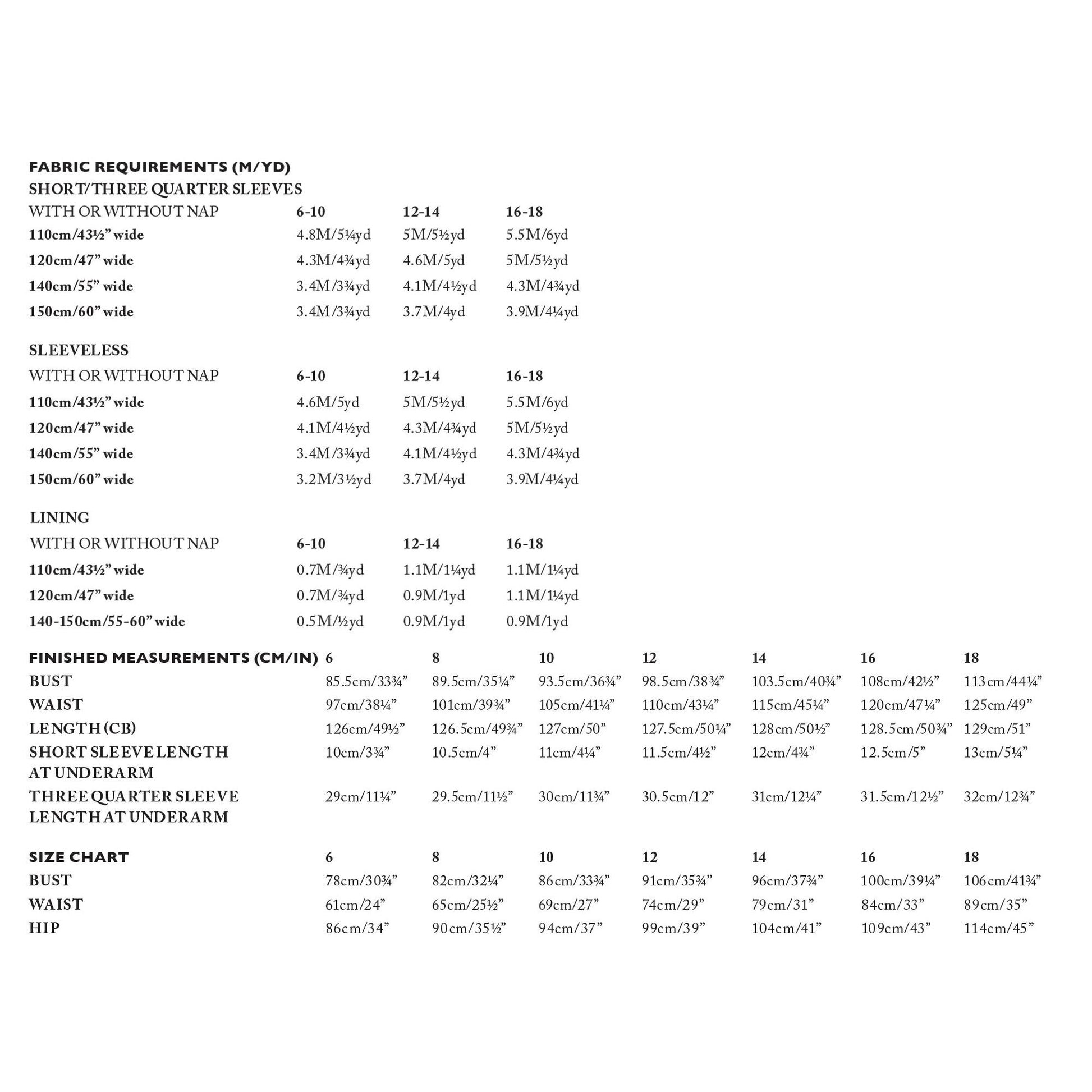 Sizes 16-18, 44” wide = 6 yards