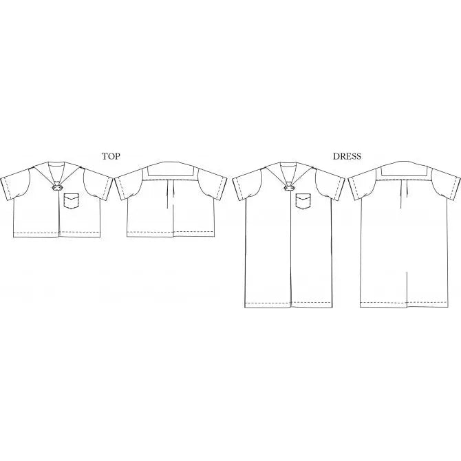 The Mary White is an loose fitting short sleeve dress and top with some neat sailor inspired details. This easy to wear piece features front and black pleat detailing, a front patch pocket, side seam pockets on the dress, and a sailor collar.