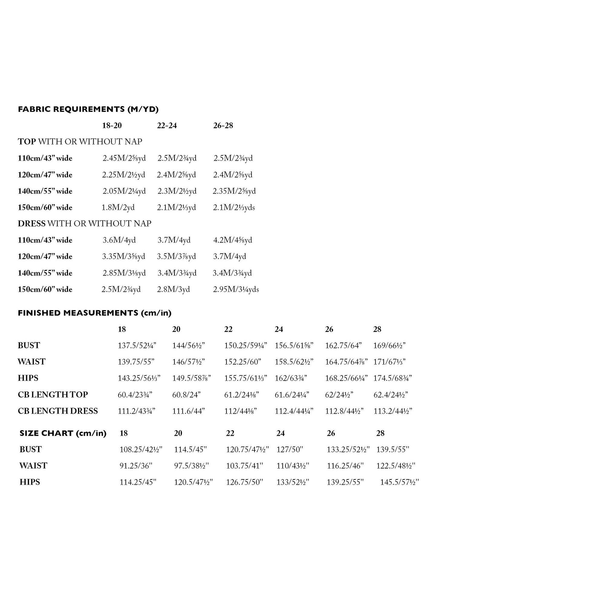Sizes: 18 - 28 included; Bust: 42.5" - 55", Waist: 36" - 48.5"