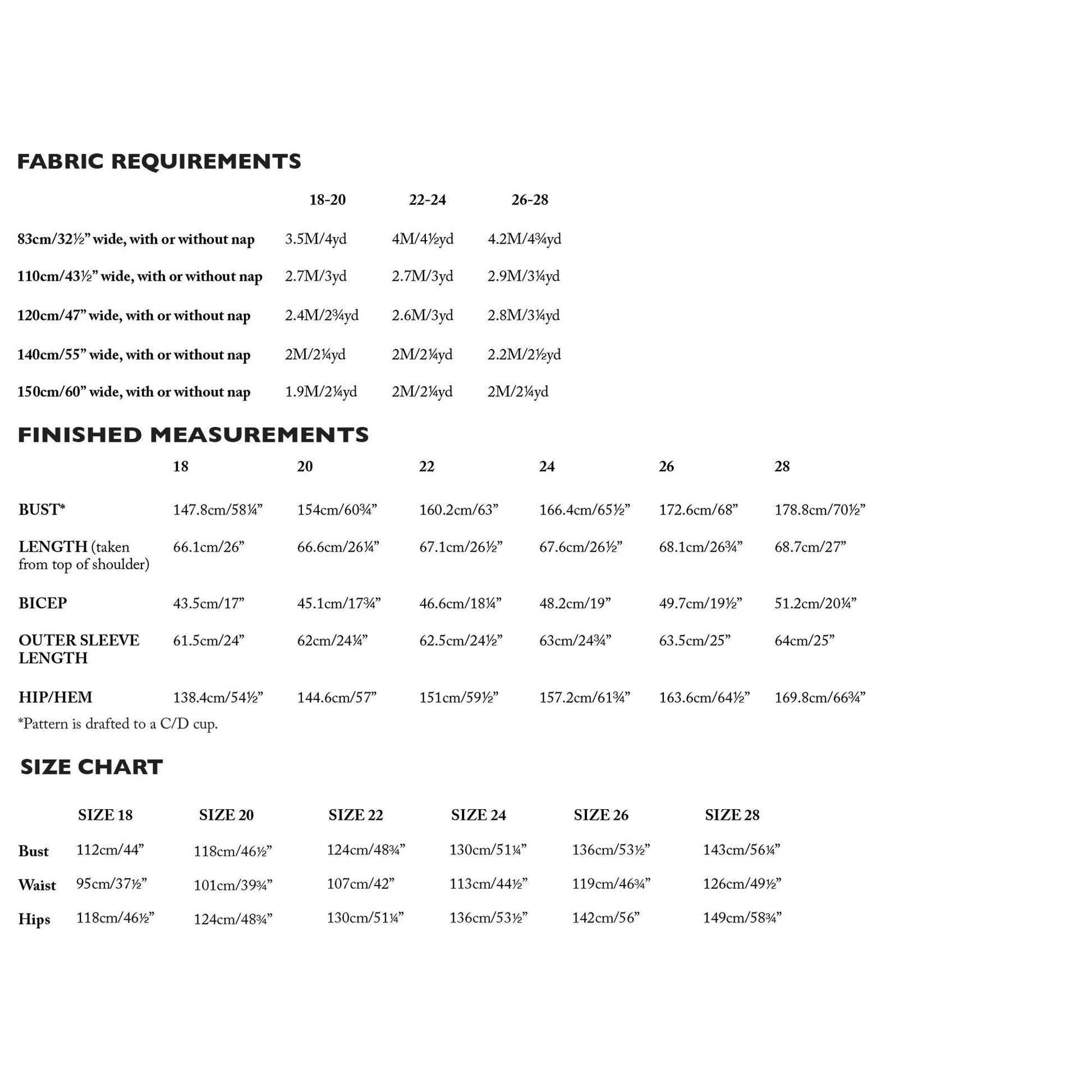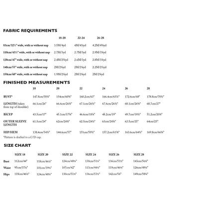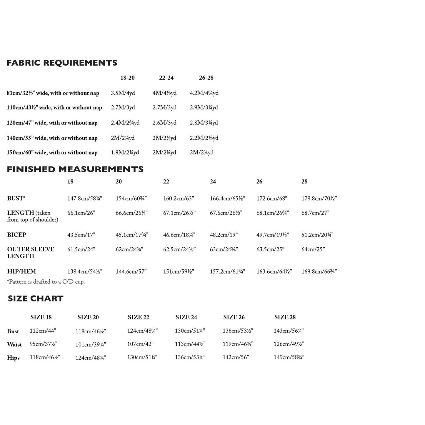 Sizes: 18-28 included; Bust: 44" - 56.25", Waist: 37.5" - 49.5"