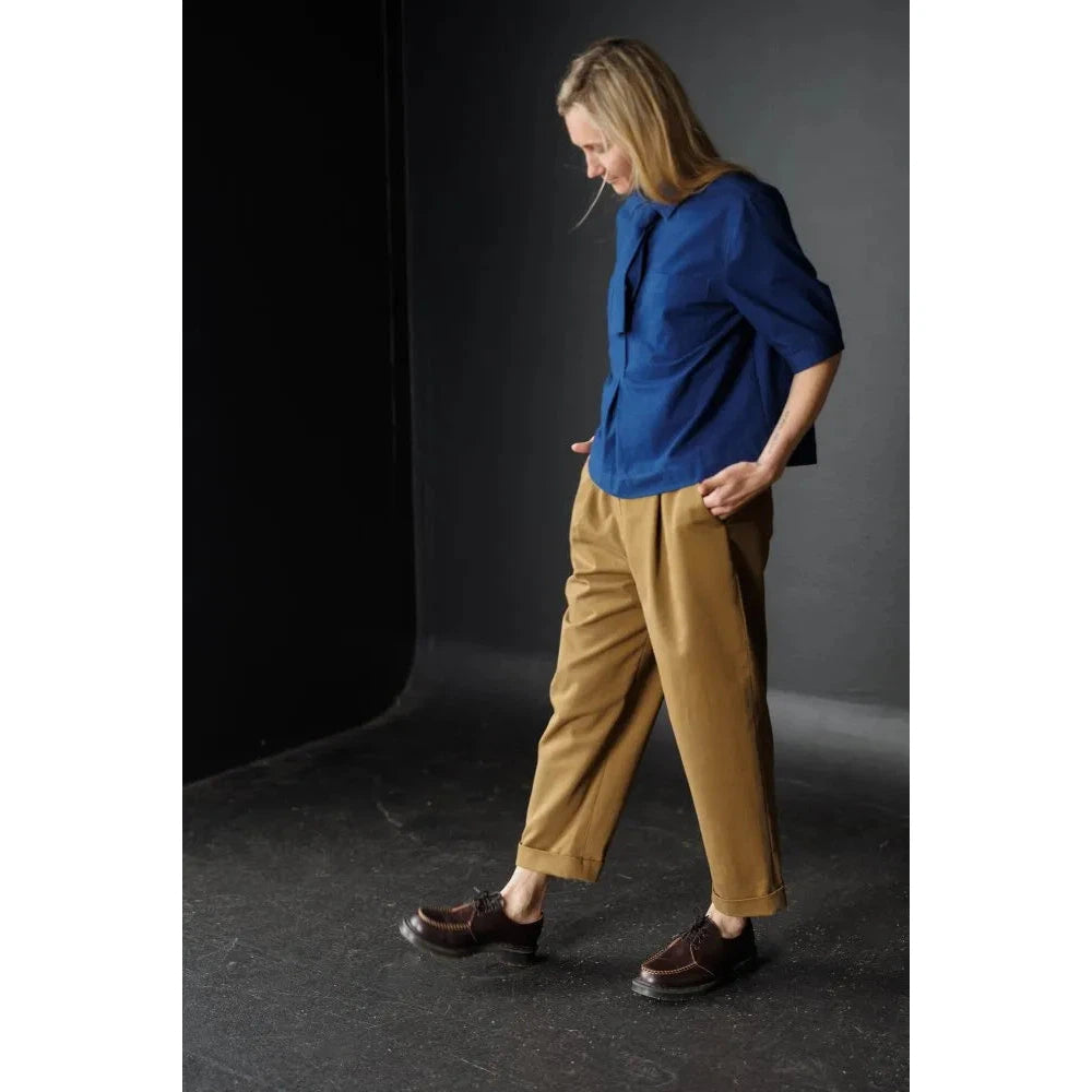 The Peg trousers feature a fly front and have classic angled pockets and turn-ups. These 'peg' trousers can be half lined if sewn with wollen fabrics.