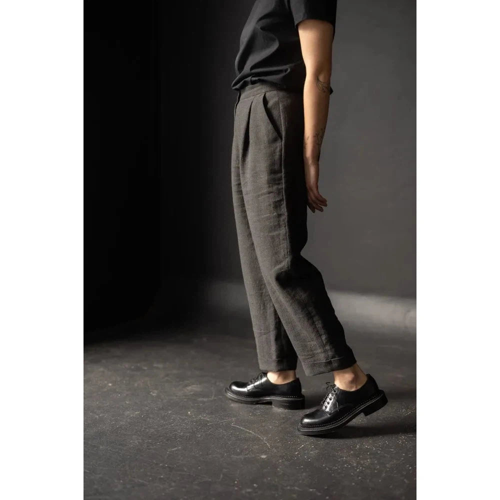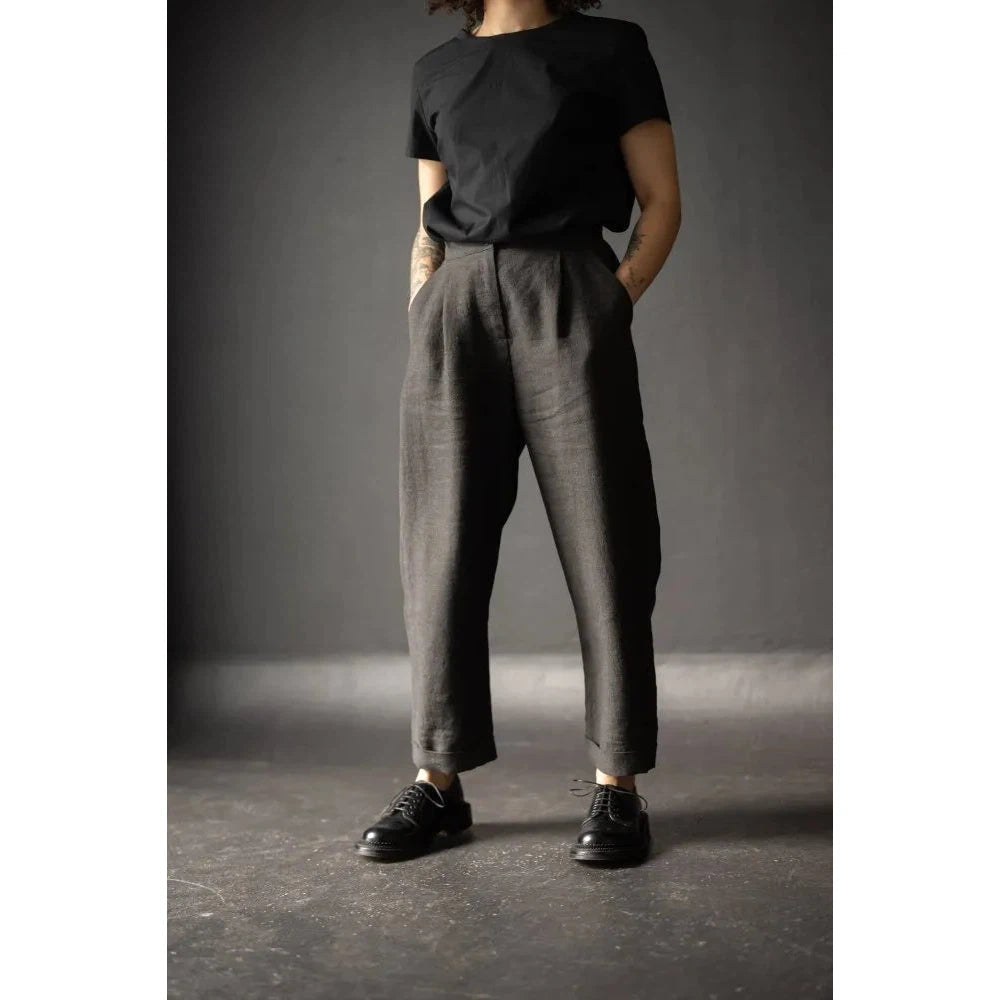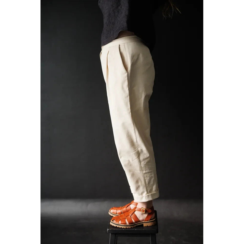 The Peg trousers feature a fly front and have classic angled pockets and turn-ups. These 'peg' trousers can be half lined if sewn with wollen fabrics.