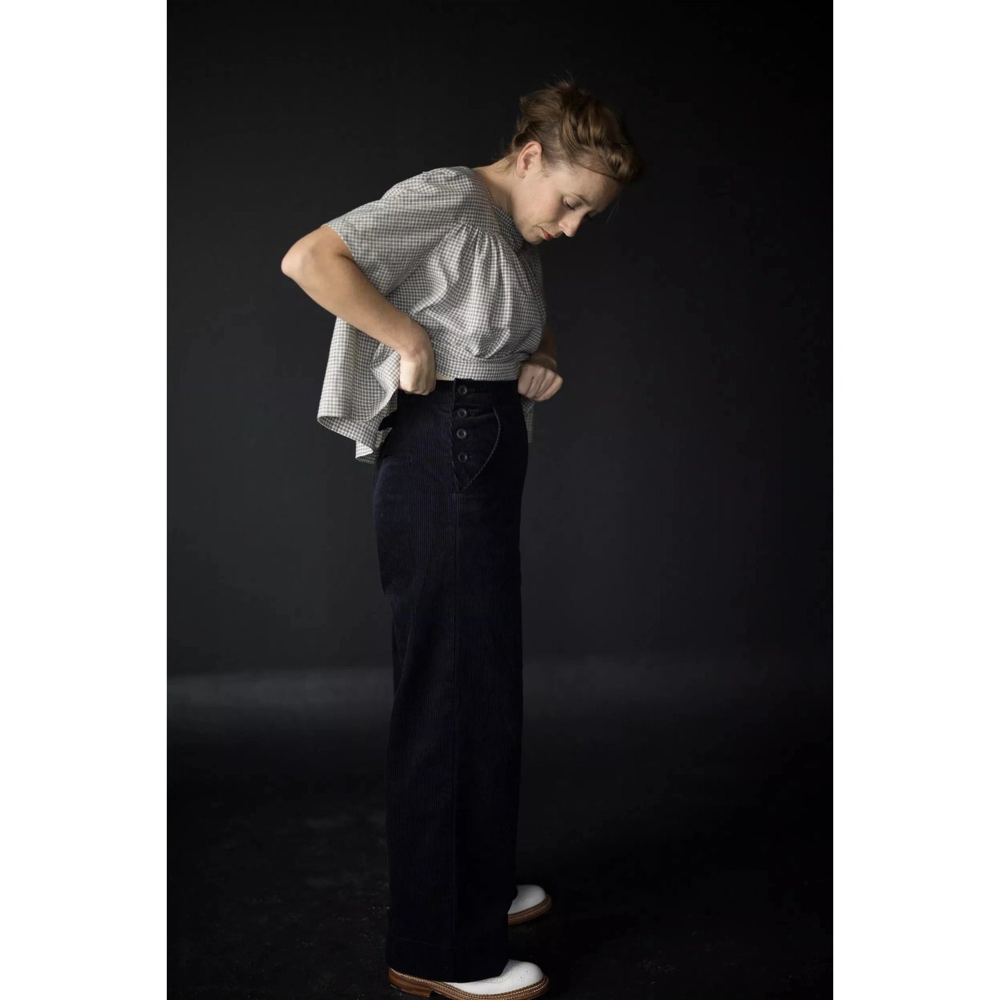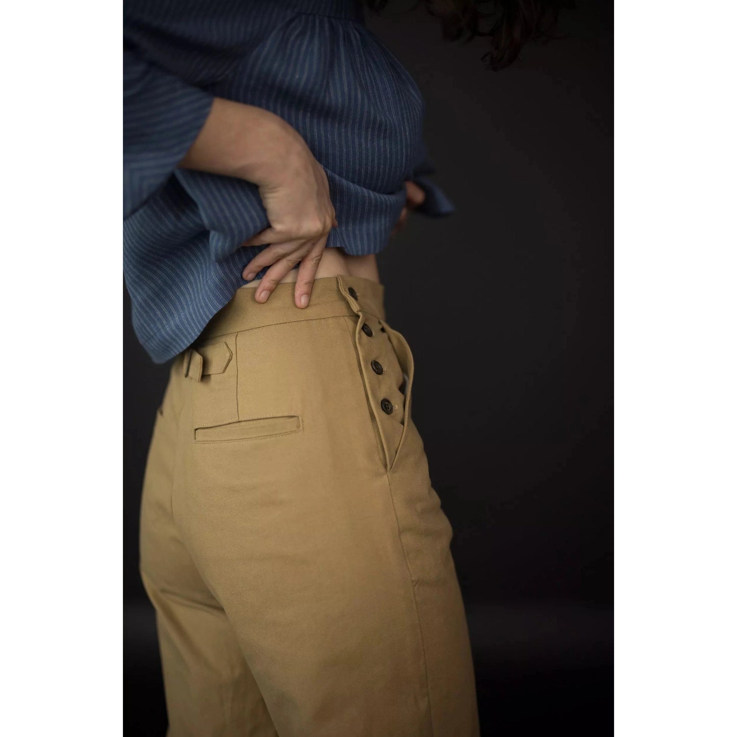 The Quinn trousers are inspired by classic wide-legged sailor’s pants. The trousers feature charming front pockets with button openings and back welt pockets.
