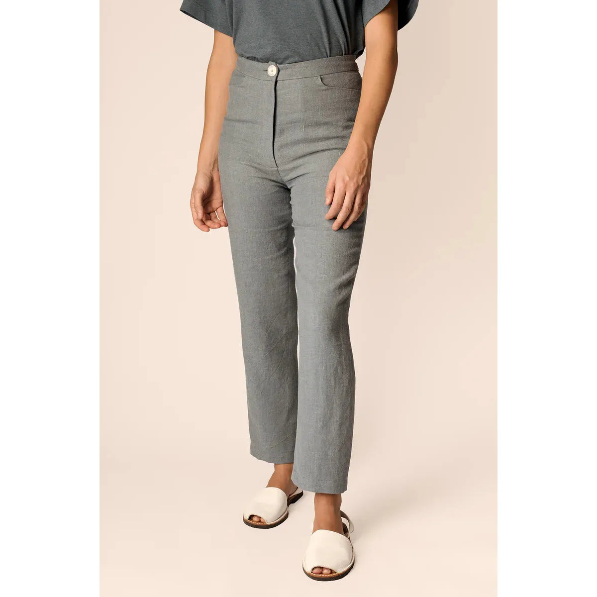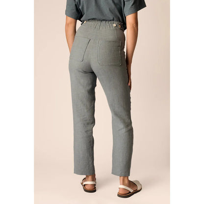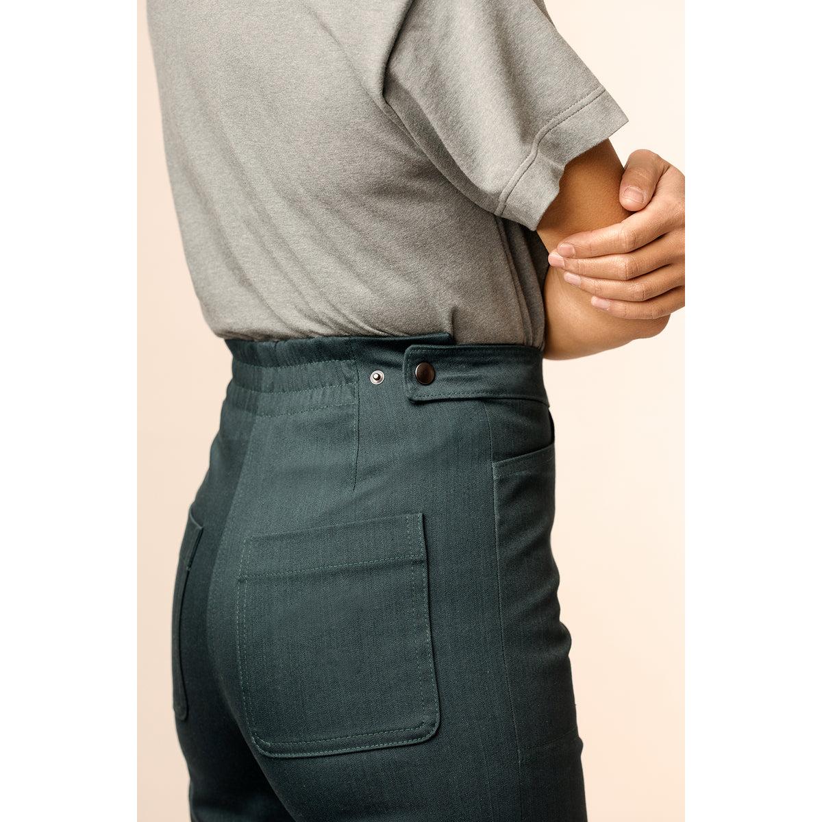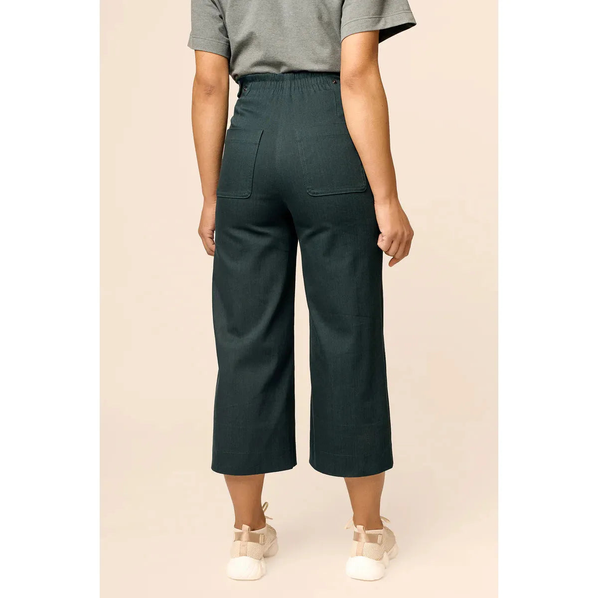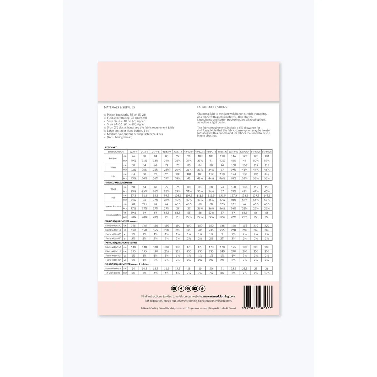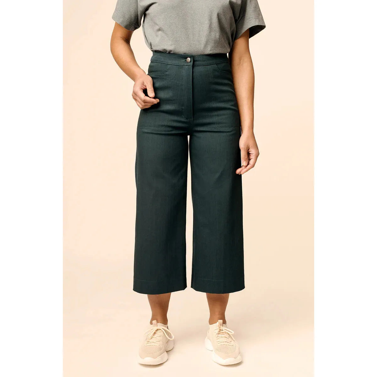 The Aina is a classic trouser pattern that also can be sewn as fashionable culottes. Both pant versions feature a fly zipper closure, front pockets, and patch pockets at the back. The trousers and culottes are lightly fitted with a high rise waist and elastic back for a more comfortable fit, plus the waistband is adorned with a button closure for extra visual interest.
