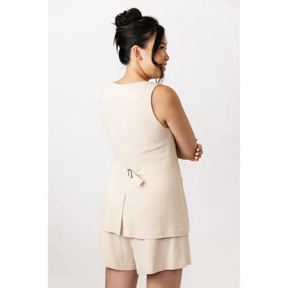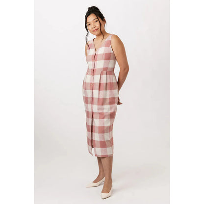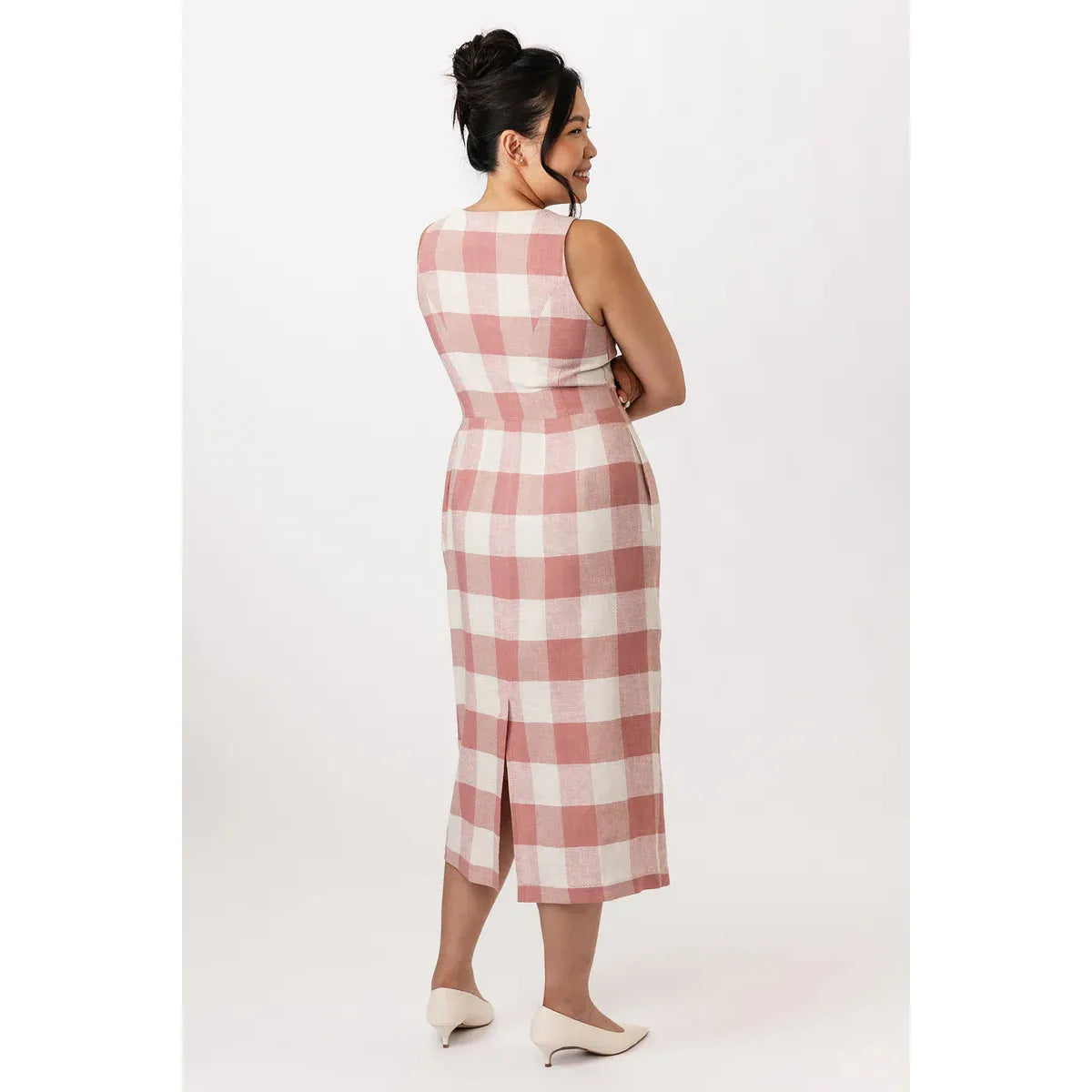 The Asteri pattern is a sophisticated sleeveless midi dress that also includes an version for a stylish vest top. The dress includes in-seam side packets and the vest features patch pockets that sit at the hip. Both versions are unlined and feature a princess cut, buttons at the front, and a V-neck.