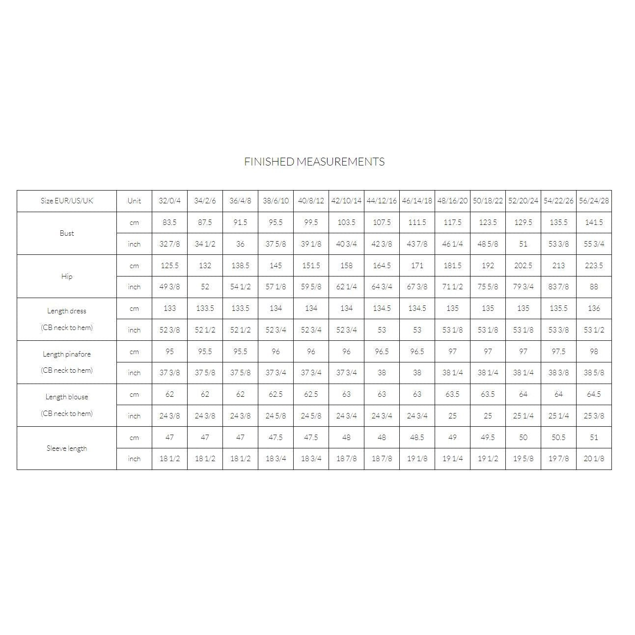 Sizes: 0-24 included; Bust: 29.875” - 52.75”, Waist: 23.625” - 46.5”