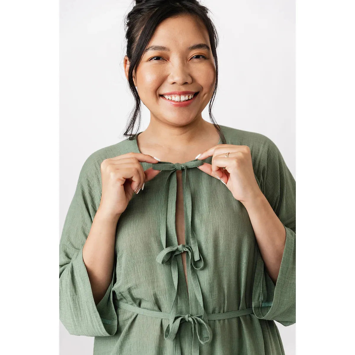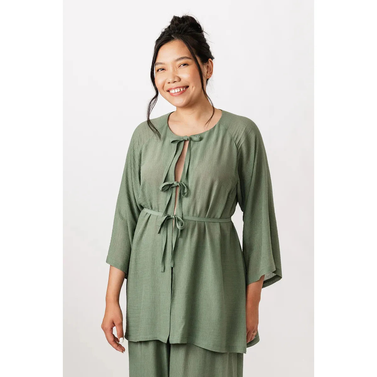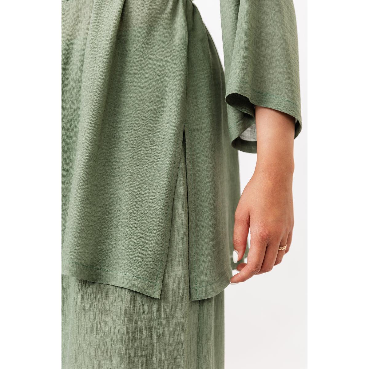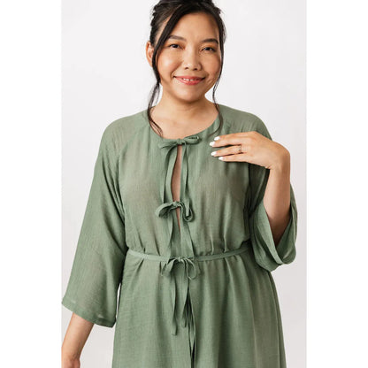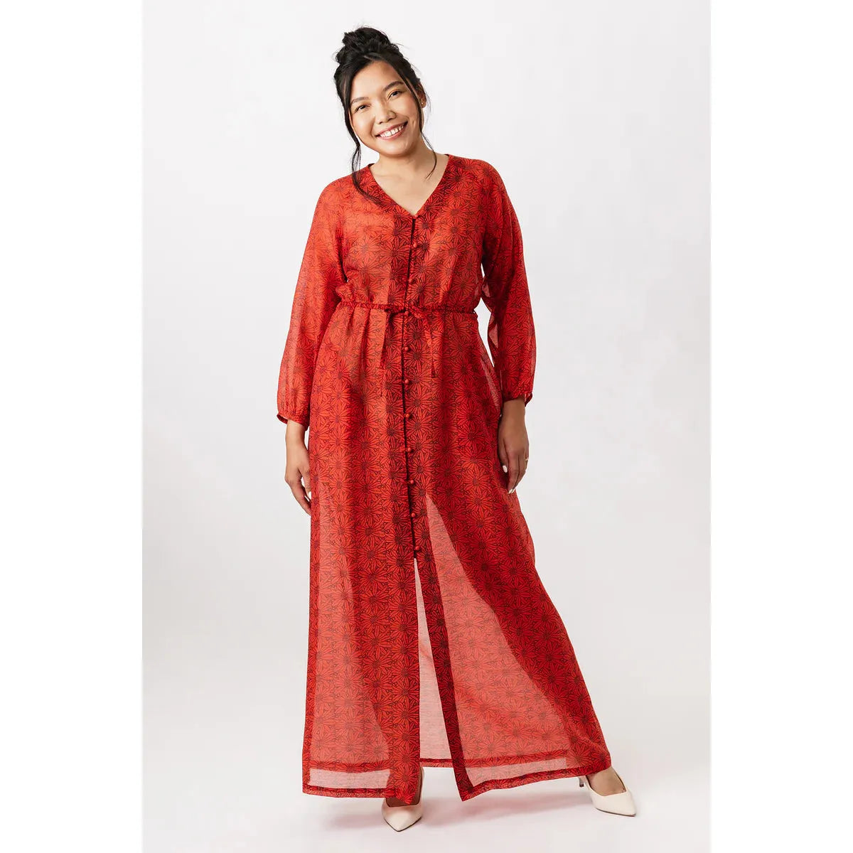 The Maite pattern includes two versions. The dress is a casually elegant maxi dress with a V-neck, long puffed sleeves, and side pockets. The tunic features an O-neckline that is fastened down the front with ties, and straight 3/4-length sleeves. Both versions are sewn with raglan sleeves and come with a delicate belt at the waist.