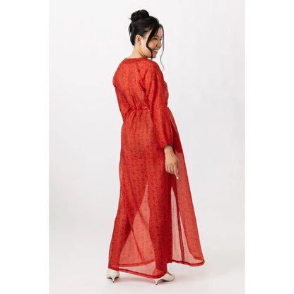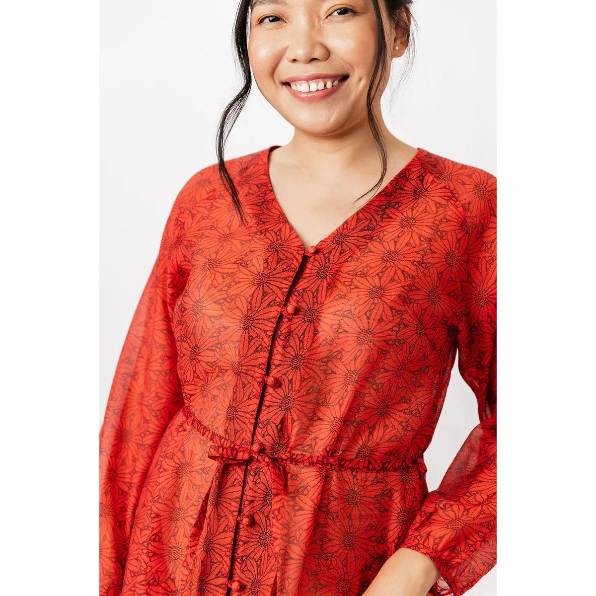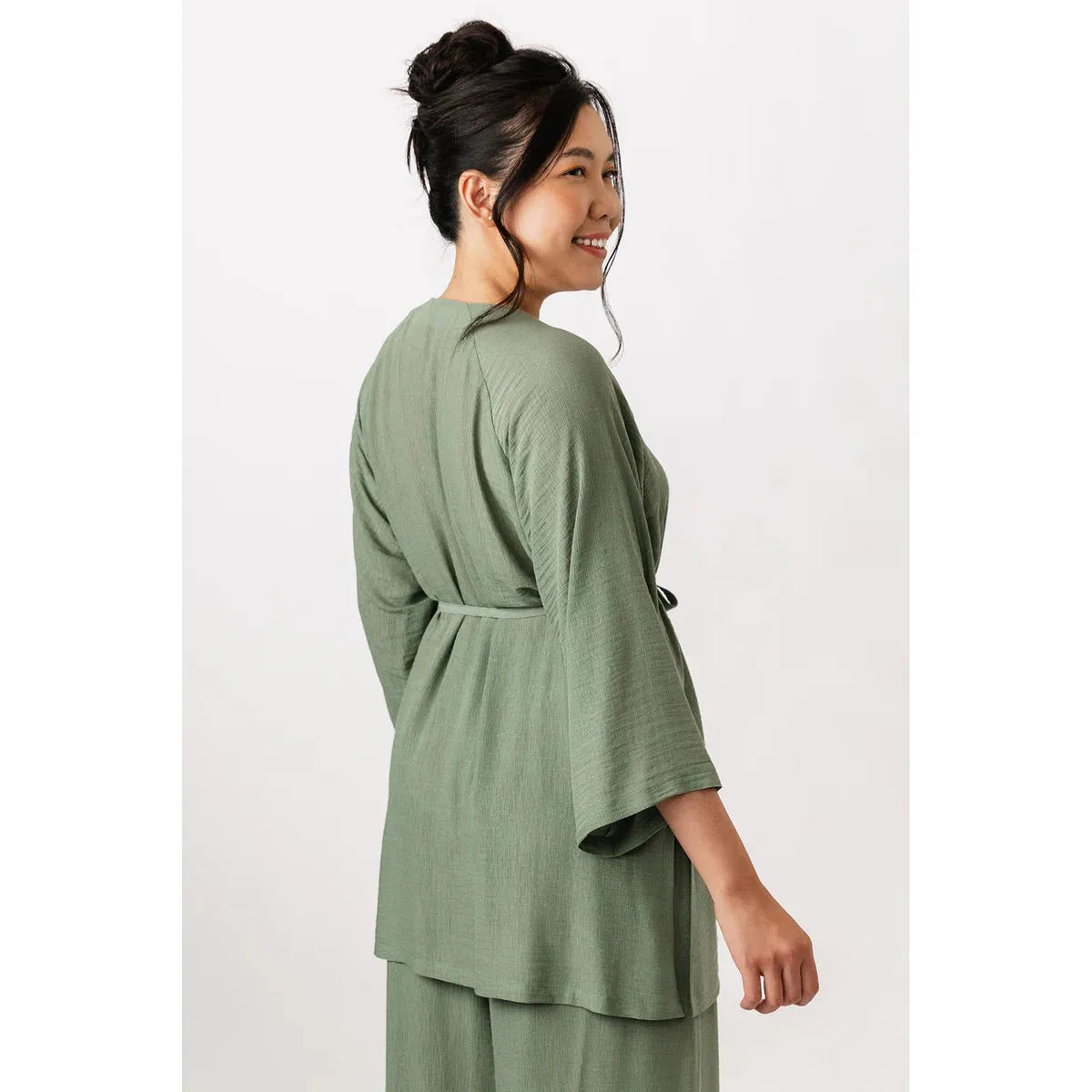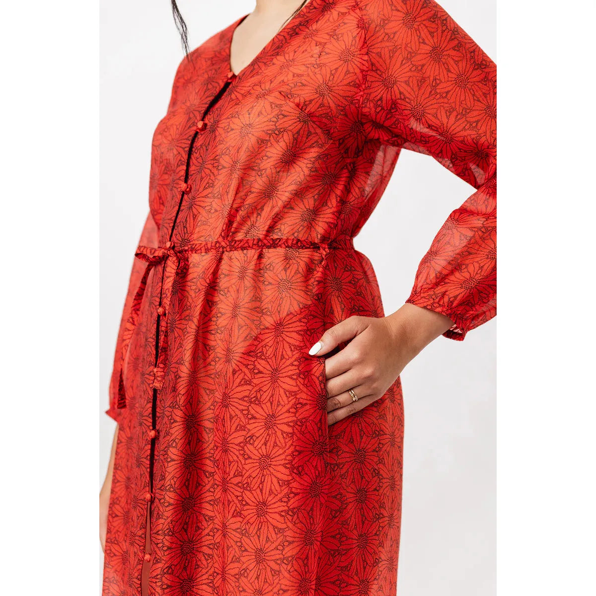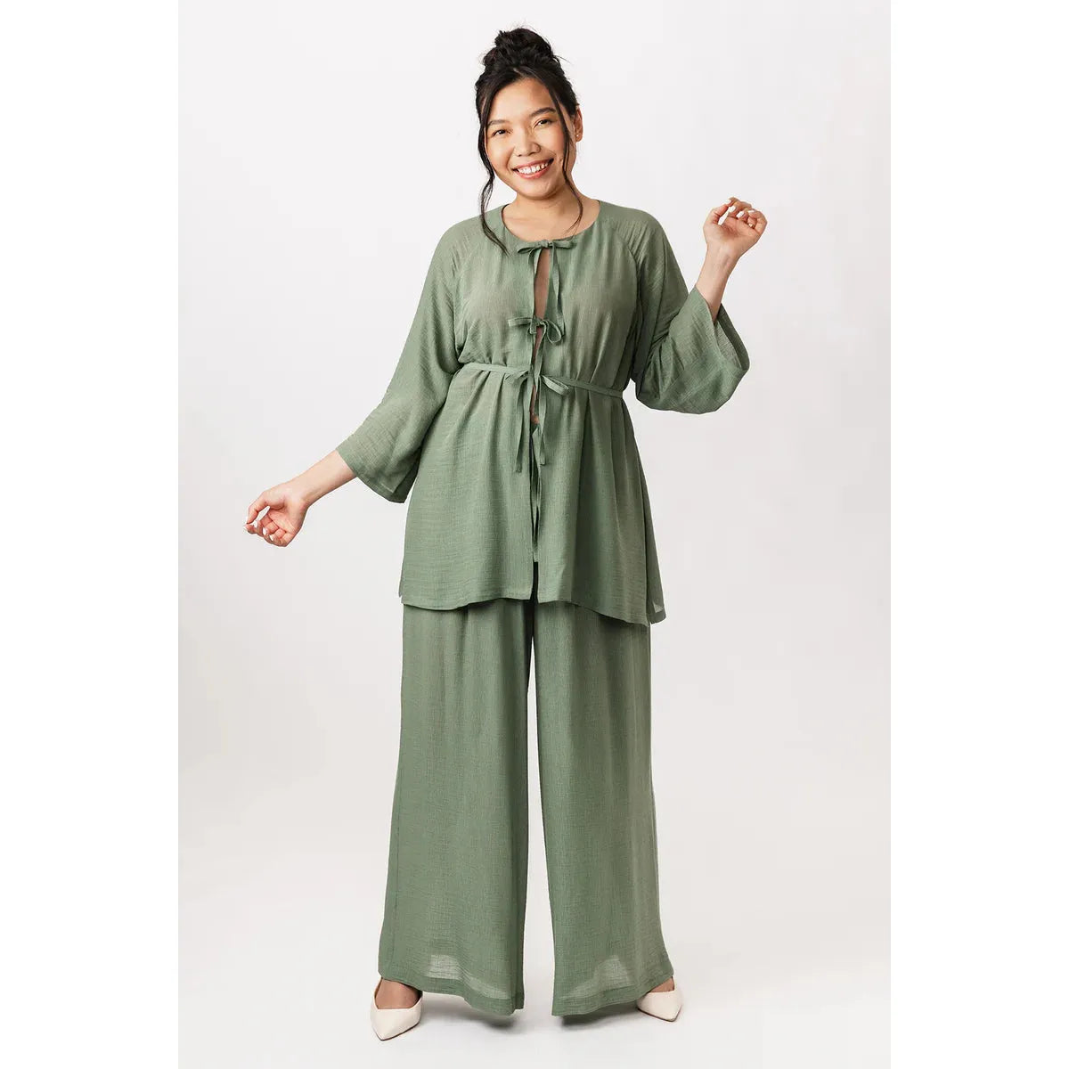 The Maite pattern includes two versions. The dress is a casually elegant maxi dress with a V-neck, long puffed sleeves, and side pockets. The tunic features an O-neckline that is fastened down the front with ties, and straight 3/4-length sleeves. Both versions are sewn with raglan sleeves and come with a delicate belt at the waist.