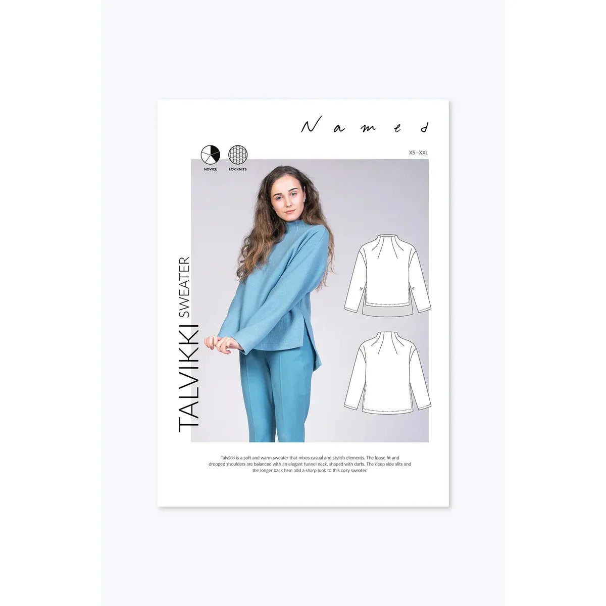 The Talvikki sweater features a dropped shoulder, a funnel neck shaped with darts, long side slits, and a lengthened back hem. All these details help to create a casual yet stylish finished sweater that will keep you cozy and warm.