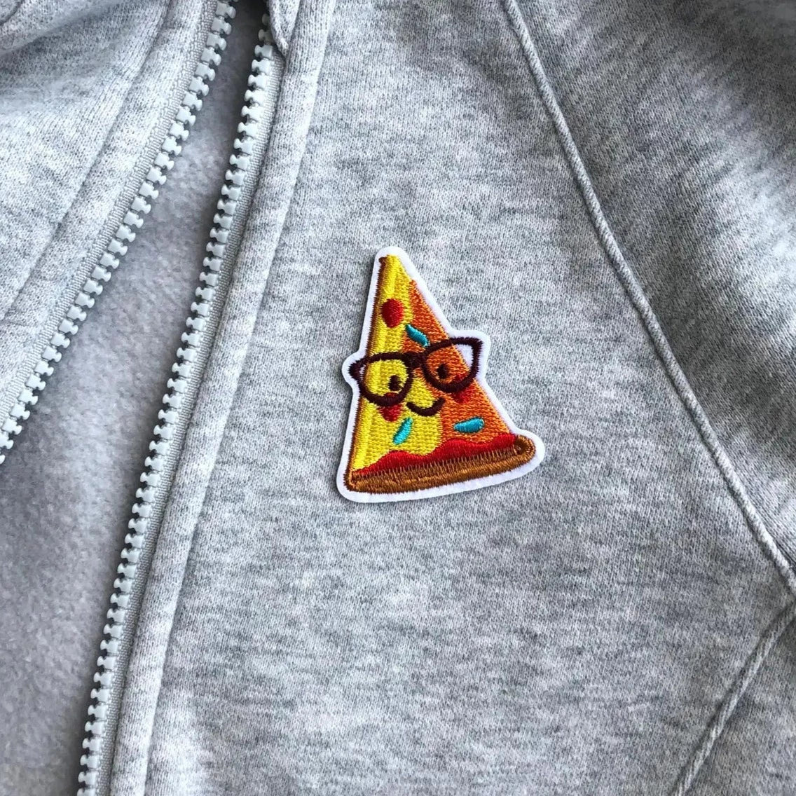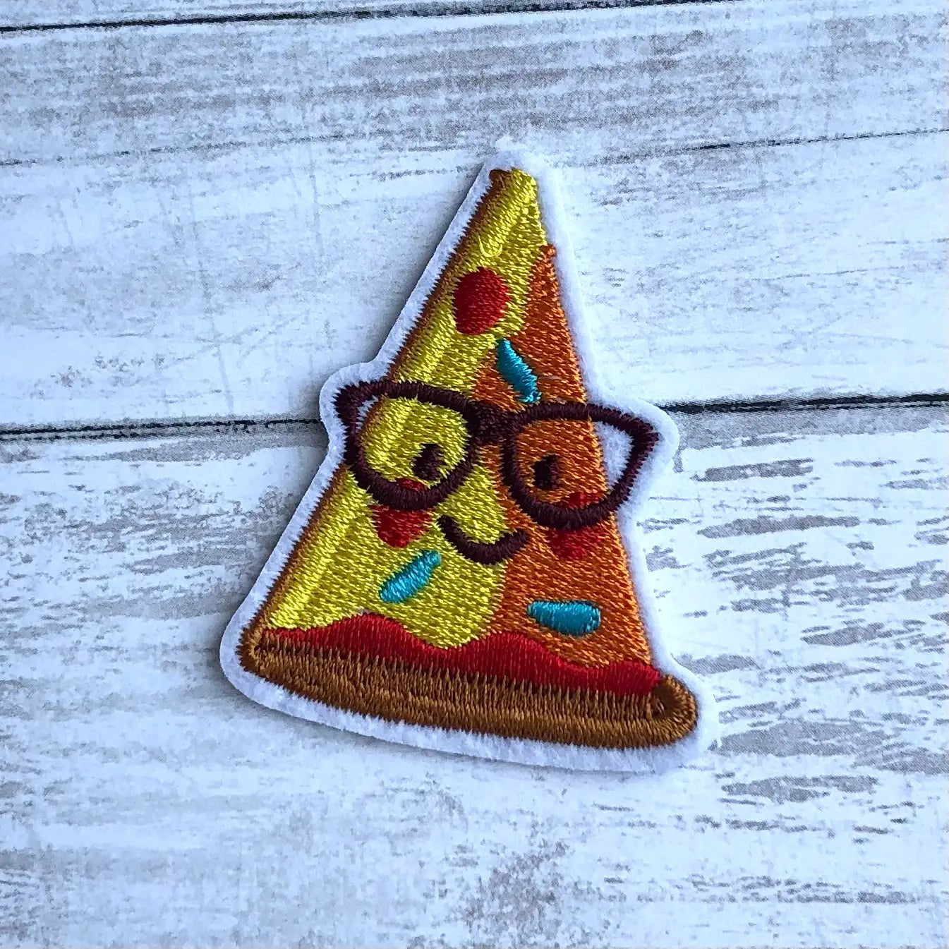 Slice of pizza in glasses, a funky iron on embroidered patch.