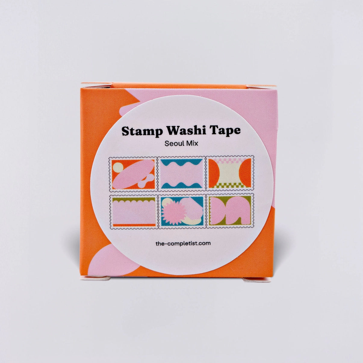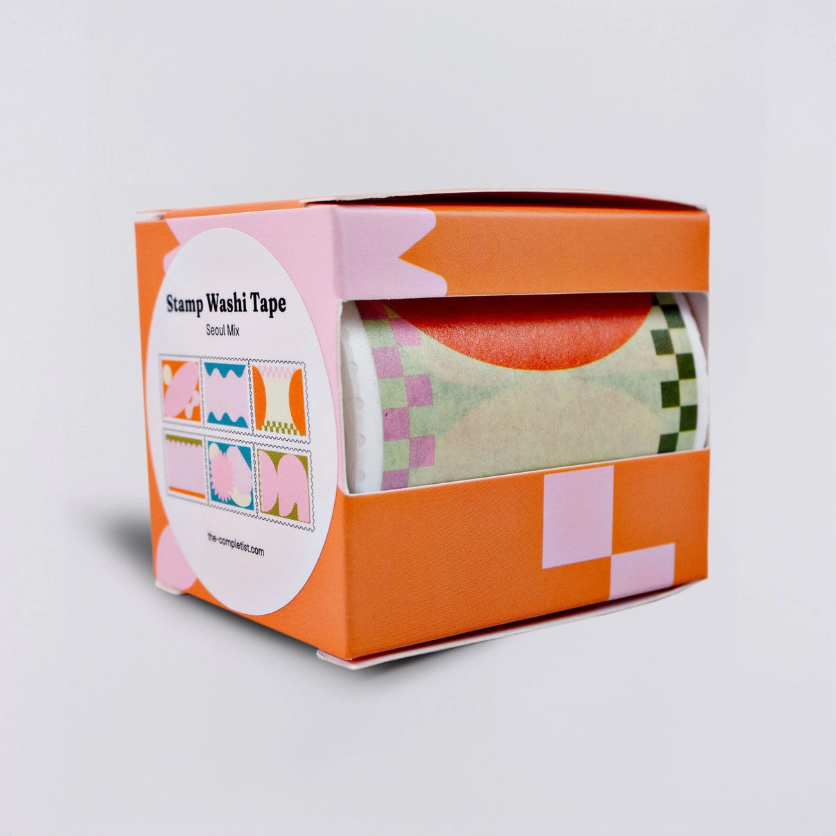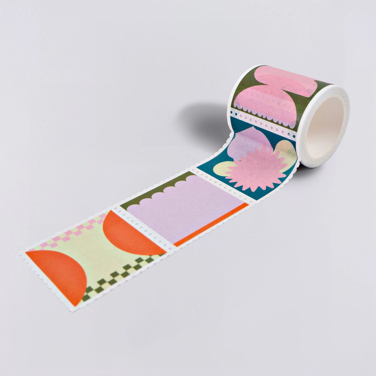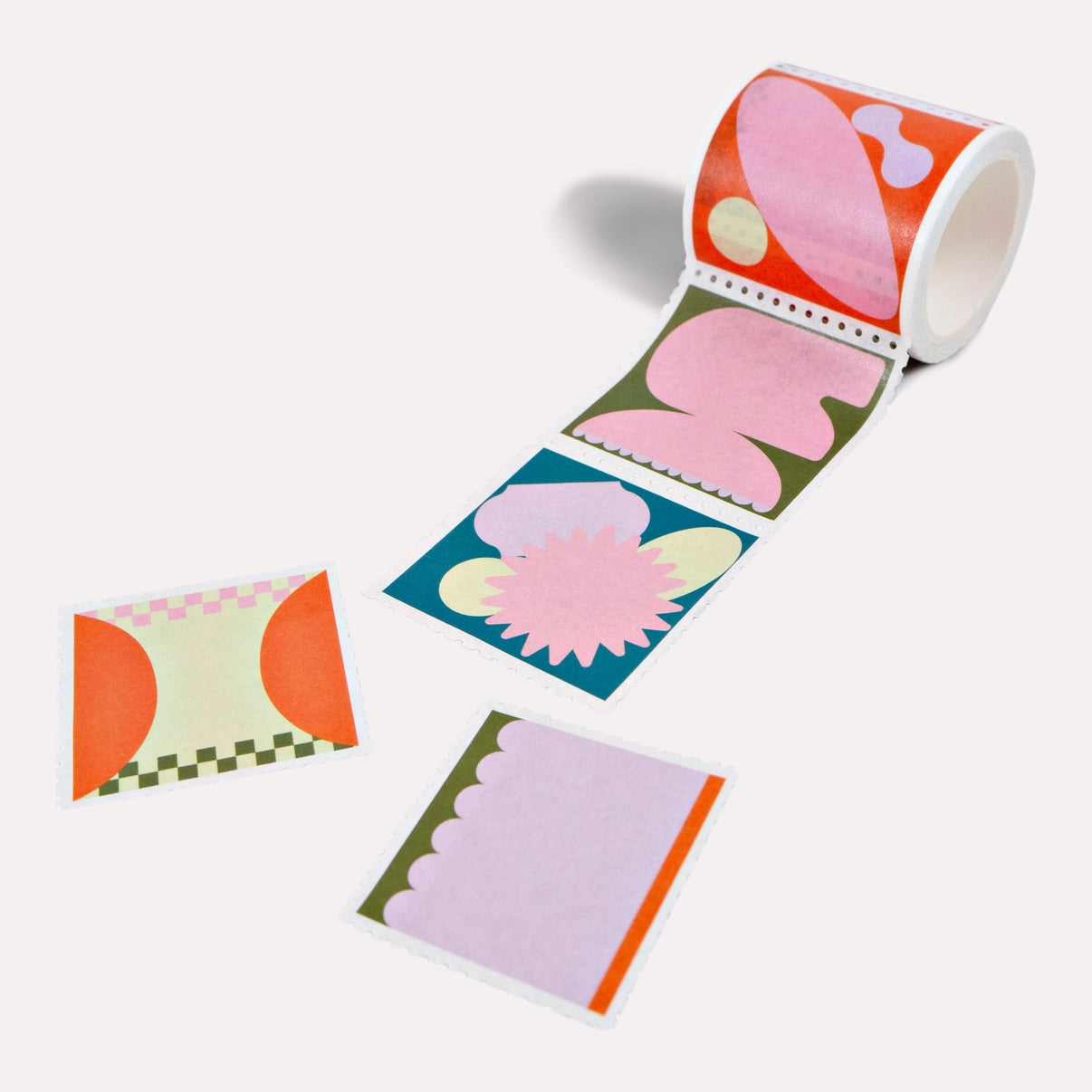 It comes packed in a cardboard box (plastic free!) It's 50mm wide and 5 metres long. It's perforated so each piece can be pulled off, just like real stamps!