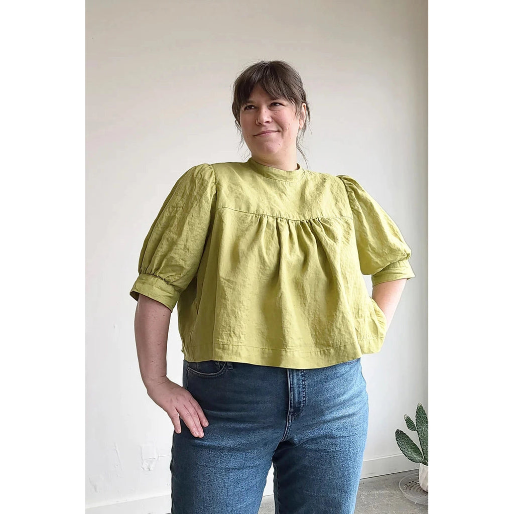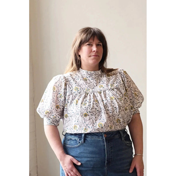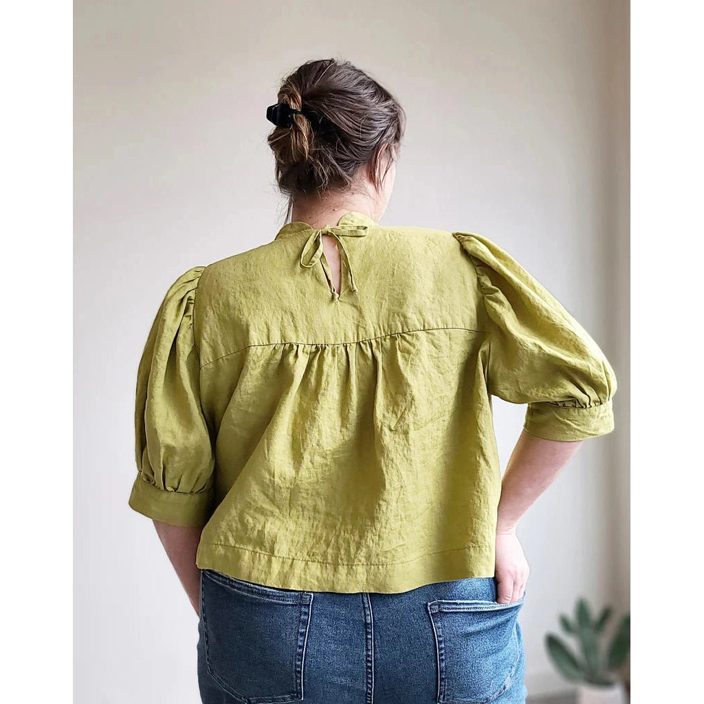 The Regalia Blouse is a timeless top that creates an effortless yet elegant look. It features a stand-up high collar, puffed sleeves, center front and back gathers, with a back keyhole opening and tie closure. Choose between a looser cropped hem, a longer hem with optional waist tie, and two different sleeve lengths to curate your perfect combination.