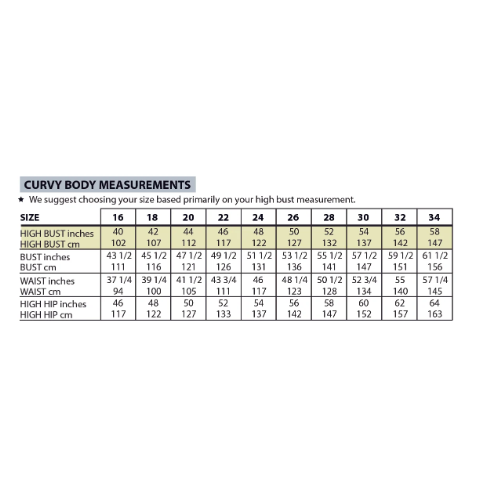 Sizes: 16-34 included; Bust: 43.5" - 61.5", Waist: 37.25" - 57.25"