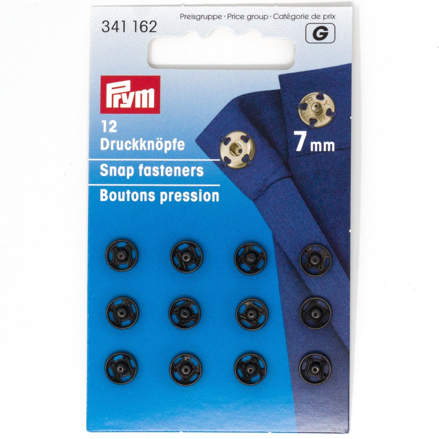 Each pack includes 12 sets of 7mm snap fasteners with a black coated finish.