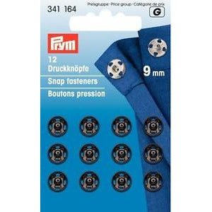 Each pack includes 12 sets of 9mm snap fasteners with a black coated finish.