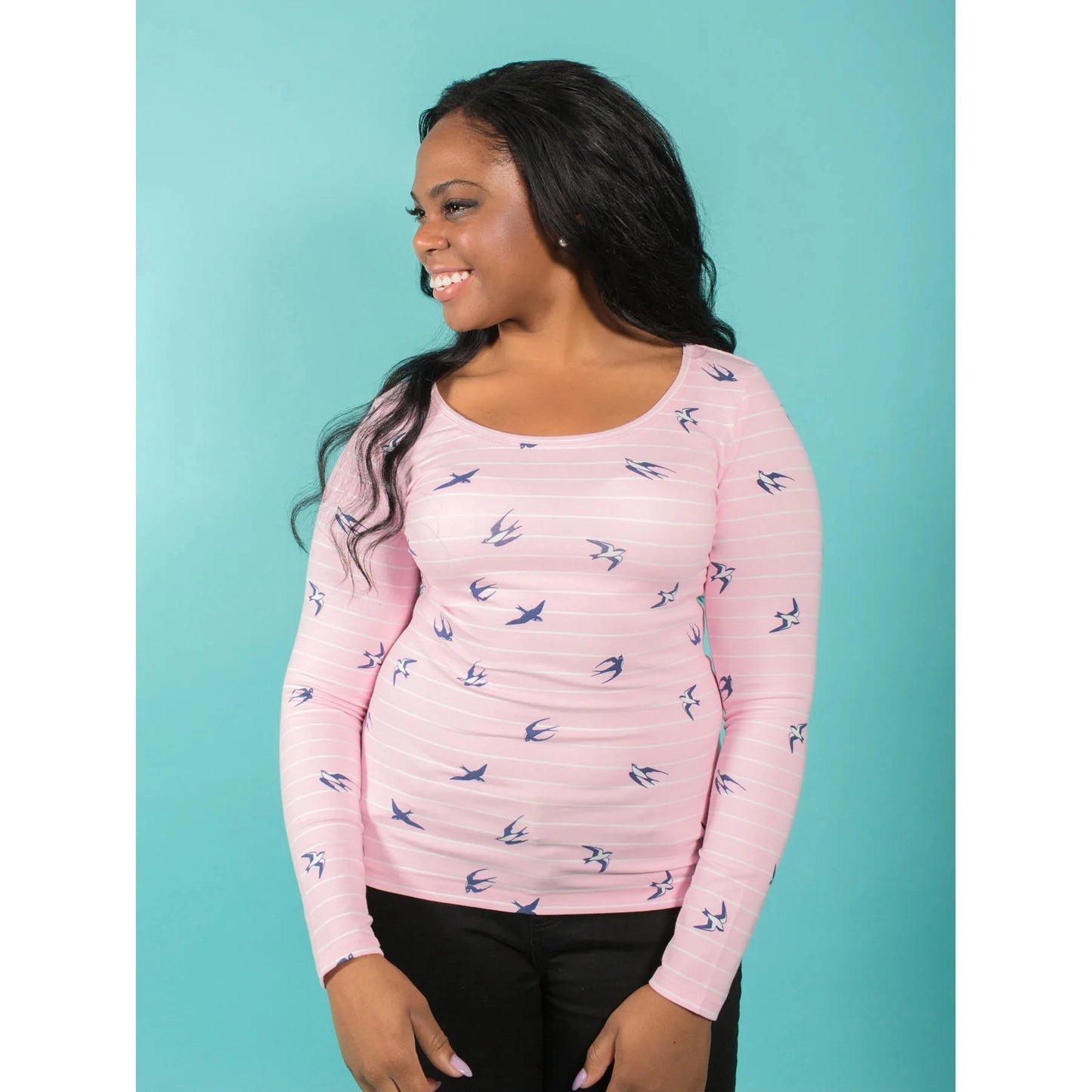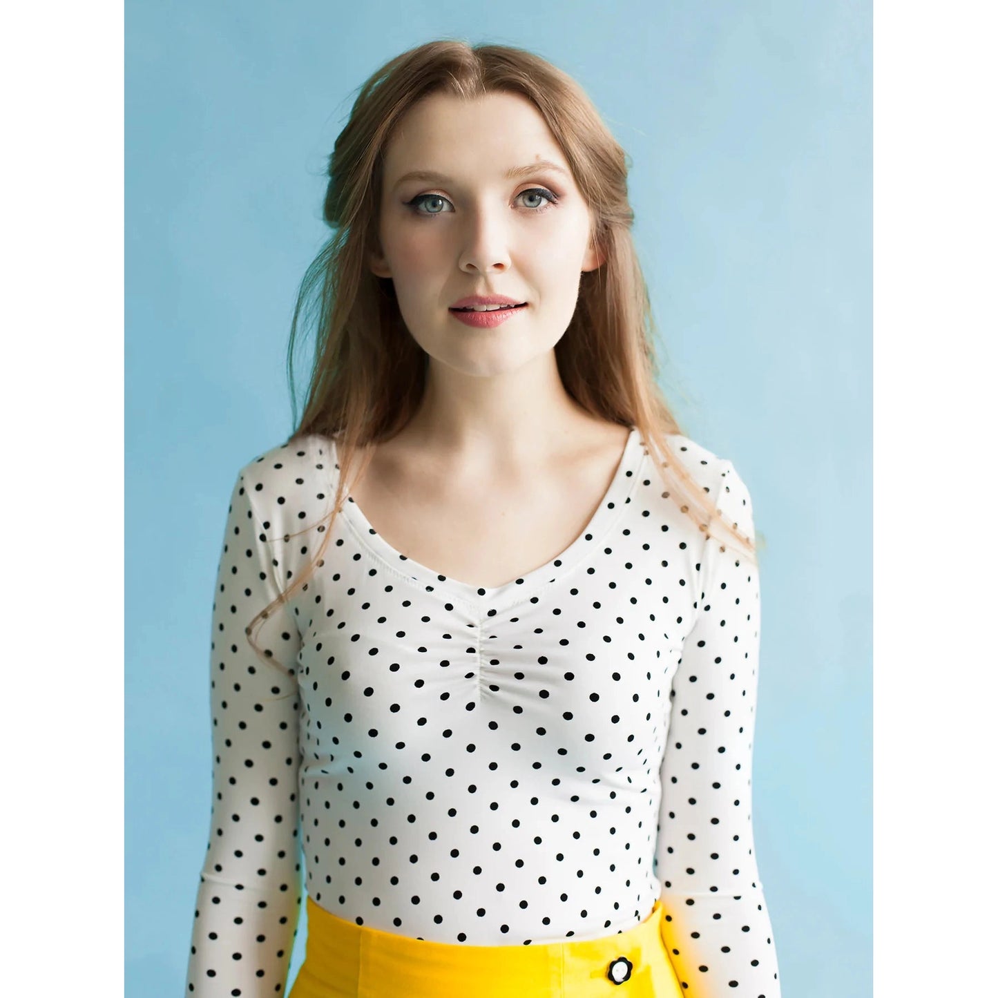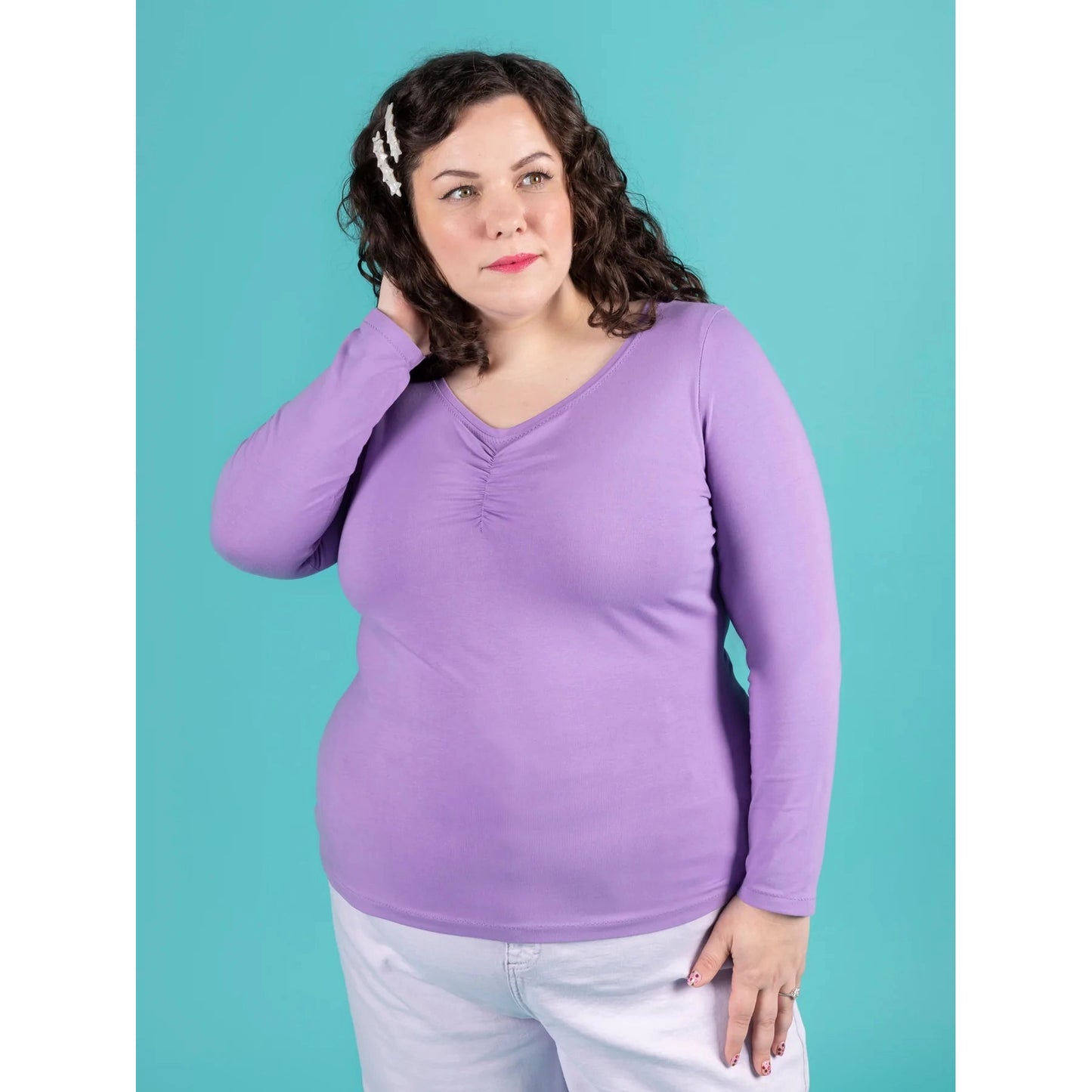 Agnes is a classic, close fitting jersey top with a narrow neckband, that can be easily sewn on your home sewing machine. Make Agnes with a scoop neckline or ruched sweetheart neckline, long or short sleeves and with plain or ruched shoulder details.