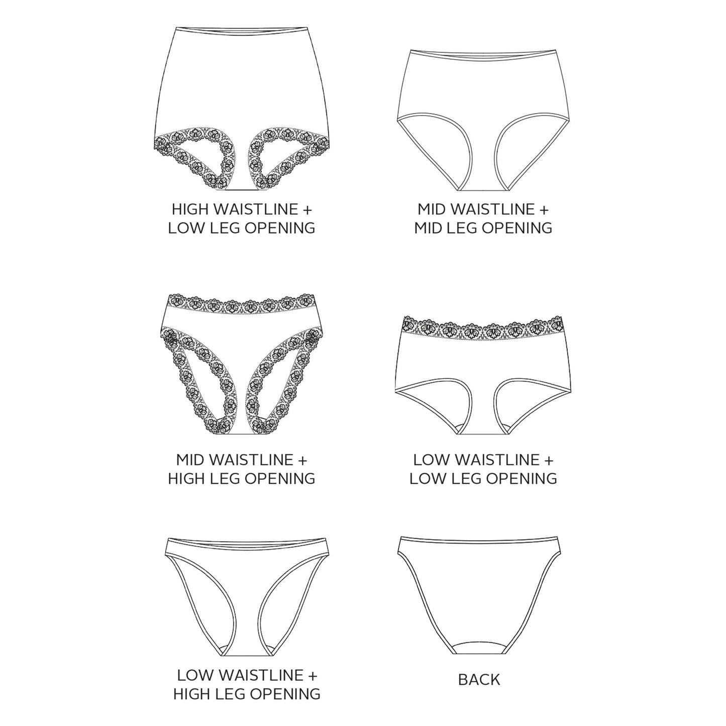 Use this pattern to make your own custom underwear! Cute and comfy, this pattern includes a variety of options to suit your style and body. The different waistline, leg opening, and finishing options make a total of 36 combinations.