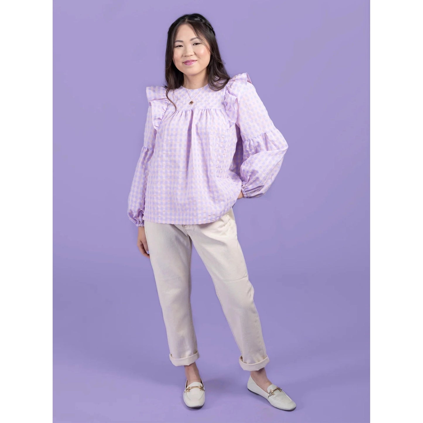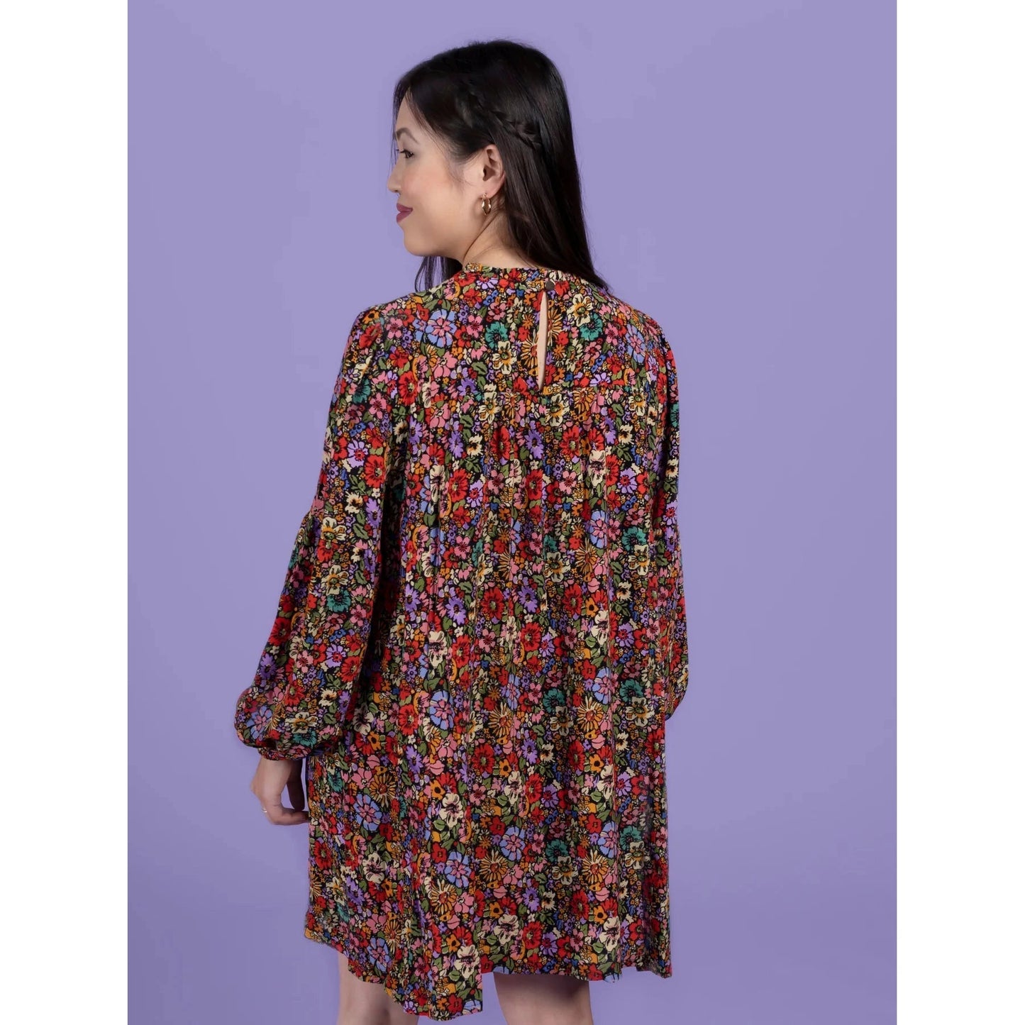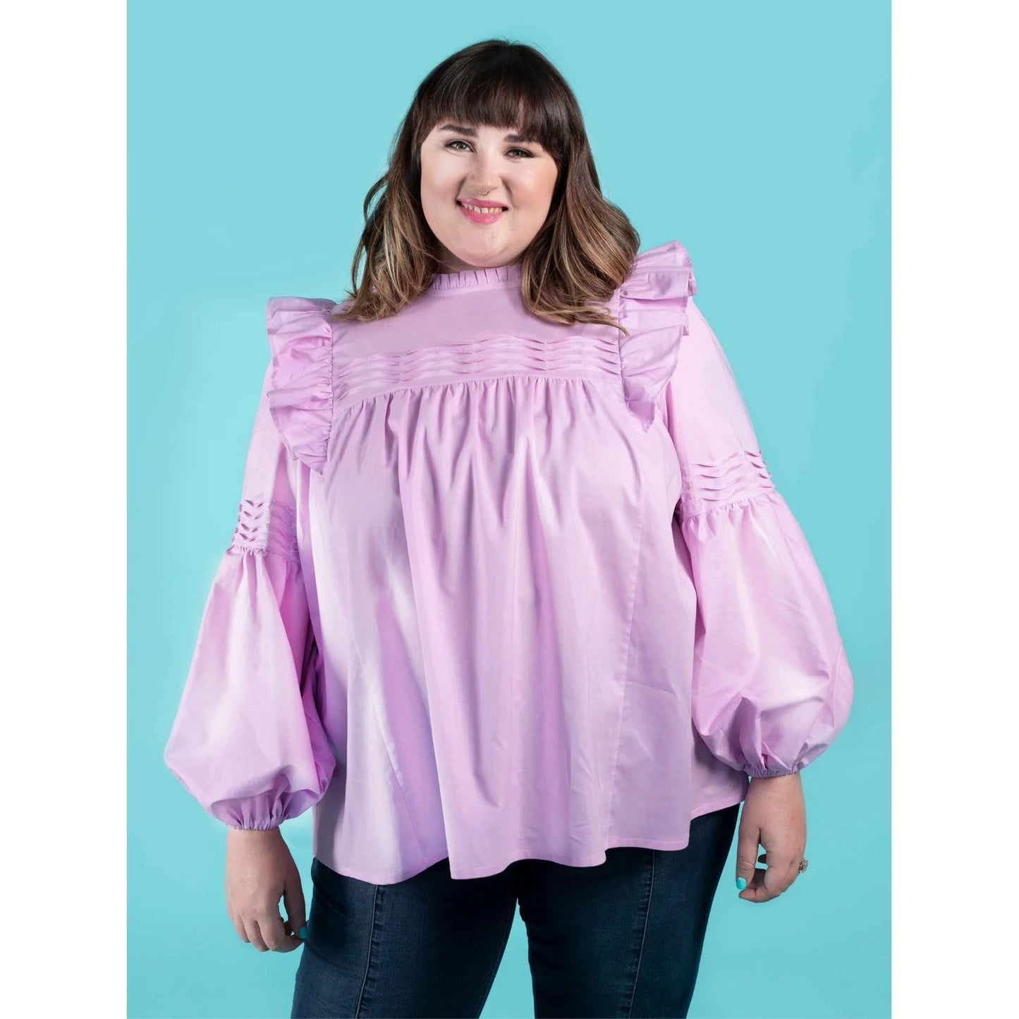 Marnie is a whimsical, smock-style blouse and mini dress. Add drama with optional shoulder ruffles, and romantic tucks on the front yoke and full-length bishop sleeves. The round neckline has an optional ruffle collar with a bias binding finish. Make Marnie as a floaty blouse or mini dress with the two included hem lengths.