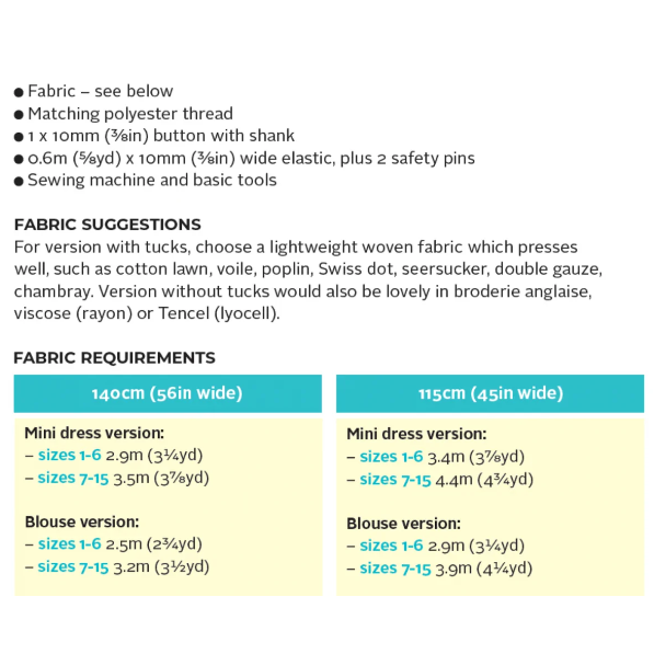 Recommended Fabrics: For the version with tucks, choose a lightweight woven fabric which presses well, such as cotton lawn, voile, poplin, Swiss dot, seersucker, double gauze, chambray. The version without tucks would also be lovely in viscose, rayon or lyocell.