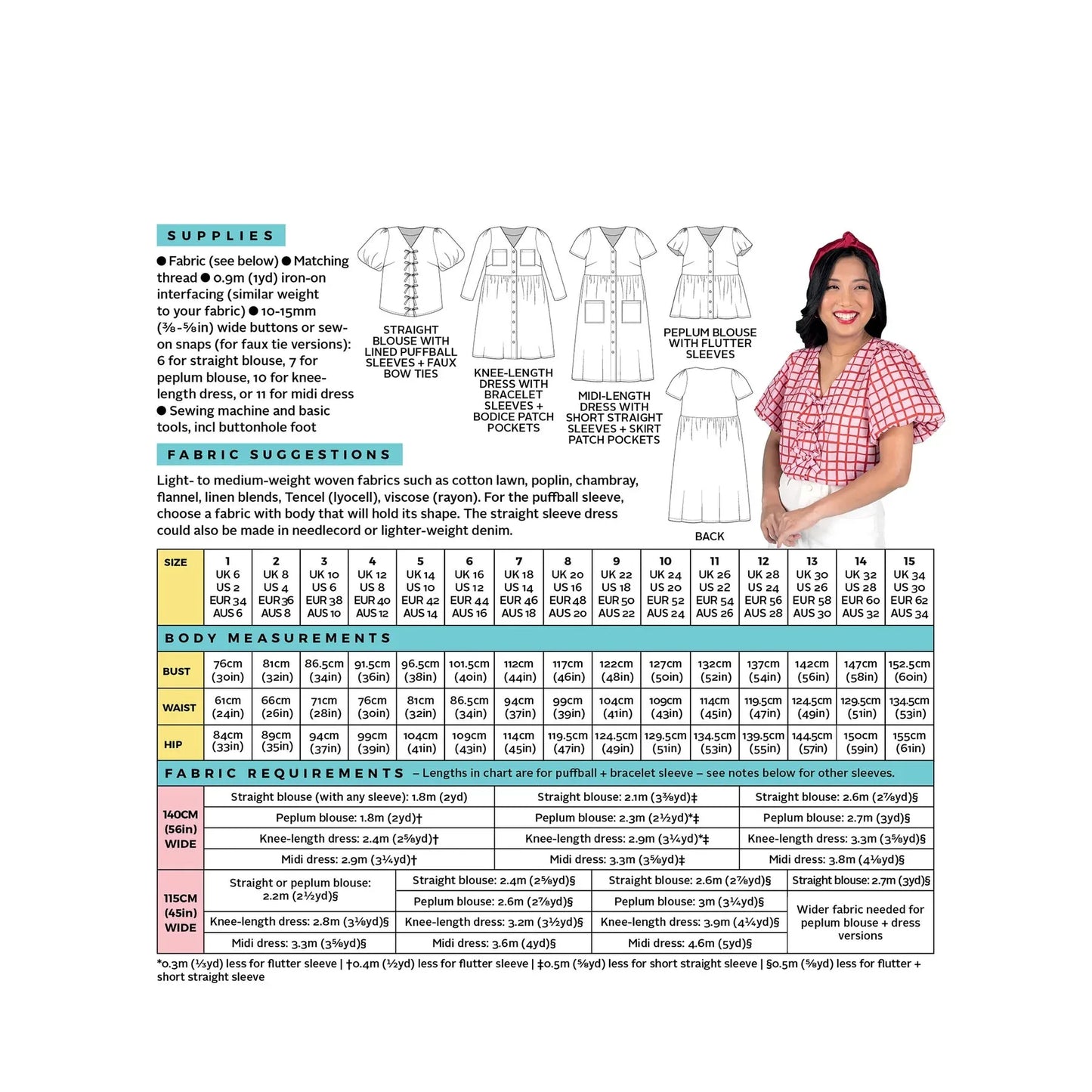 Recommended Fabrics: Light to medium-weight woven fabrics like cotton lawn, poplin, flannel or a linen blend. For the puffball sleeve ensure you use a fabric with lower drape that will hold its shape.