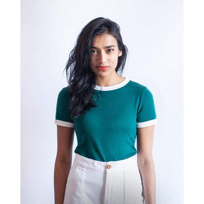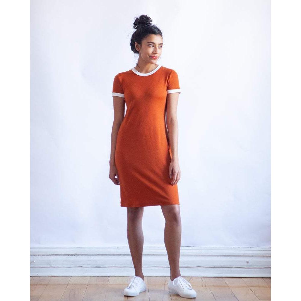 The Rio is a fitted ringer style short sleeved T-shirt or a casual dress with a vintage look. The shirt and dress feature a crew neck and contrasting ribbing at the neckline and at the sleeves. The T-shirt falls to the hip and the semi-fitted dress falls to just above the knee.